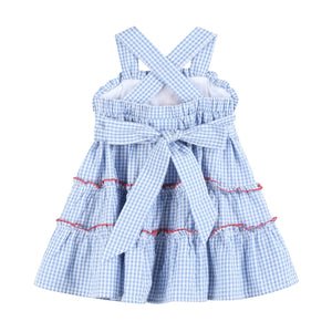Crisscross straps in the back provide a secure, comfortable fit, while the tiered ruffle skirt adds volume and a playful twirl factor. Each layer is finished with coordinating red details for a fun and lively touch.