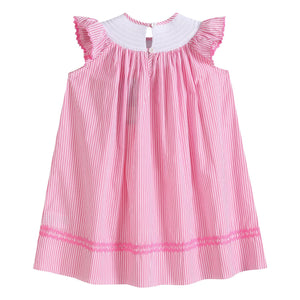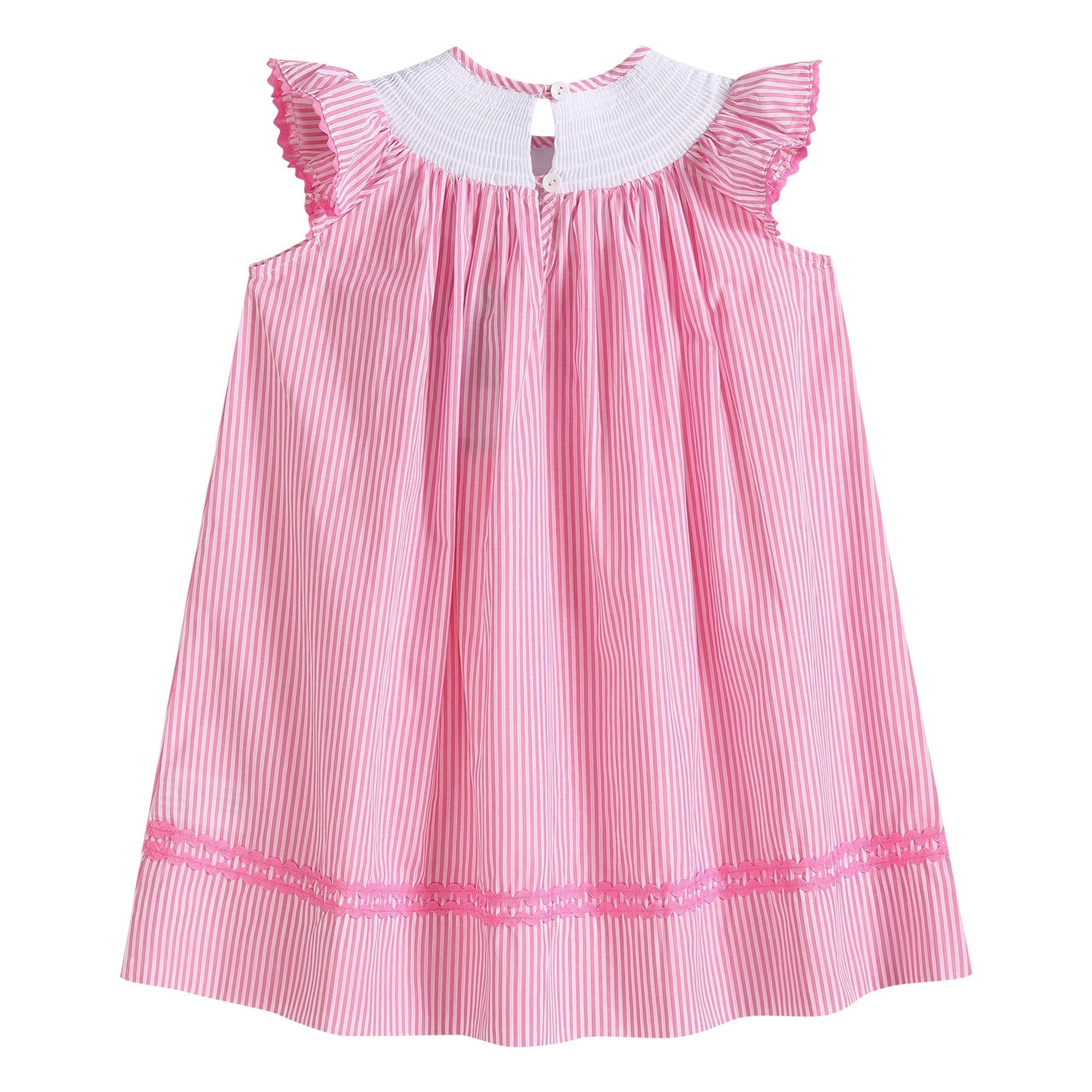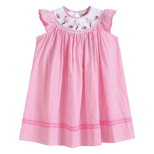 Pretty in Pink! Pretty smocking on this gorgeous pink striped bishop dress makes this an adorable addition to any little sweetie's closet. Detailed with flamingo embroidery on smocking, pretty pink trim, and is made in the softest 100% cotton. Full traditional bishop length gives this dress many years of wear. A classic Lil Cactus boutique look at an affordable price.