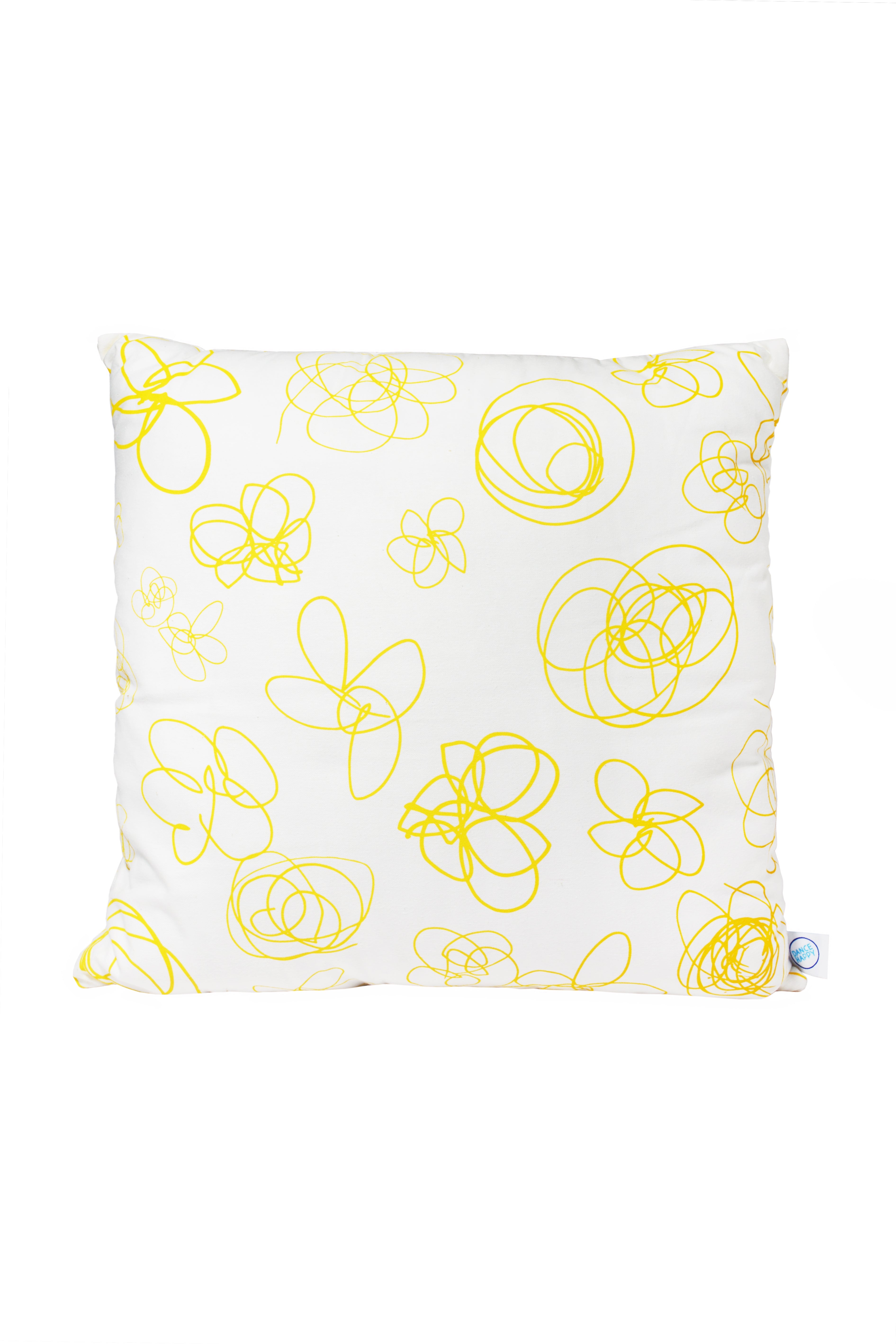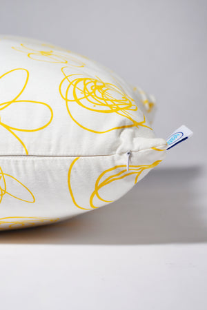 This cozy throw pillow is sure to bring joy to any room! A hand drawn floral pattern is screenprinted in sunshine yellow on white 100% cotton. There's an invisible zipper along the bottom seam so you can take the cover off an wash as needed. This pillow comes with a polyester insert that was made in Georgia, so everything from handprinting the fabric to sewing, this pillow was entirely made in the USA. Intended for indoor use only.