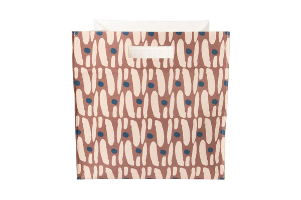 Eco-friendly storage bin made from a sturdy thick felt featuring a hand-drawn pattern digitally printed in a rust and navy colorway. This 12" x 12" storage bin is perfect for home organizing and is made to fit in cubby style shelving. The front, bottom, and back of the bin are printed with a fun pattern while the two sides are a clean white. Front and back handles make it easy to pull bin out from shelving.