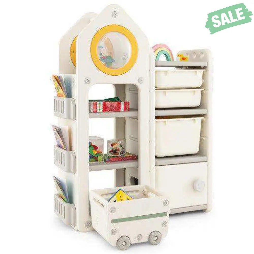 ● Outstanding Storage Capacity: This toy storage organizer includes shelf with roof 3 side bookshelves 2 middle shelves removable trolley open top shelf 2 small boxes 1 large bin and 1 enclosed cabinet. Thus items like toys books clothes snacks and sundries can be stashed well.