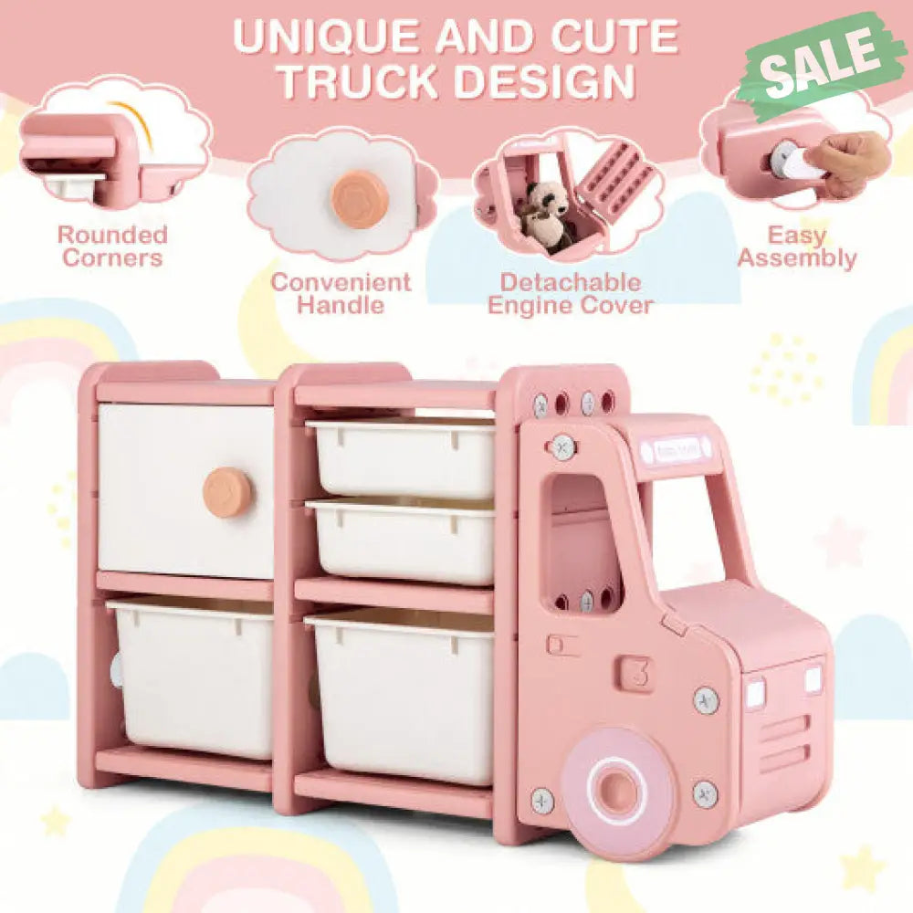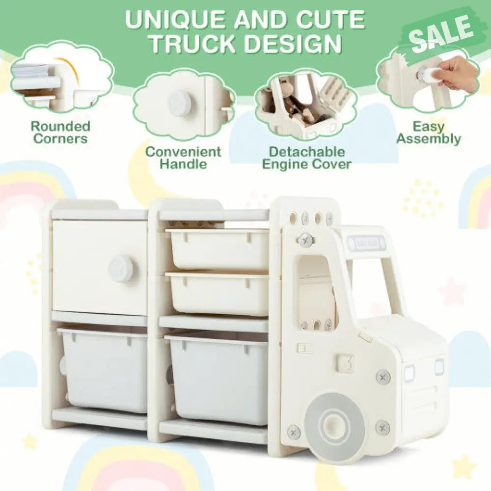 This kids truck storage organizer offers kids with 2 large storage bins 2 small drawers a single-door cabinet and a front-end storage bin.