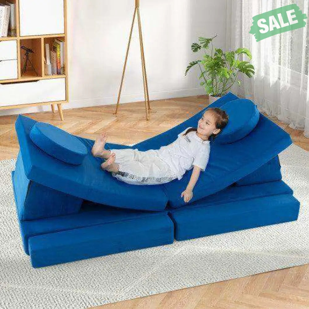 ● 10 Piece Modular Kids Sofa: Consisting of 2 trapezoidal pillows 2 rounded cushions 2 rectangular cushions a thick folding mat and a thin folding mat this 10-piece children's toy set can be easily reconfigured into a sofa a tunnel a fort a car a tent a slide a bed lounge or anything that your kids can imagine.