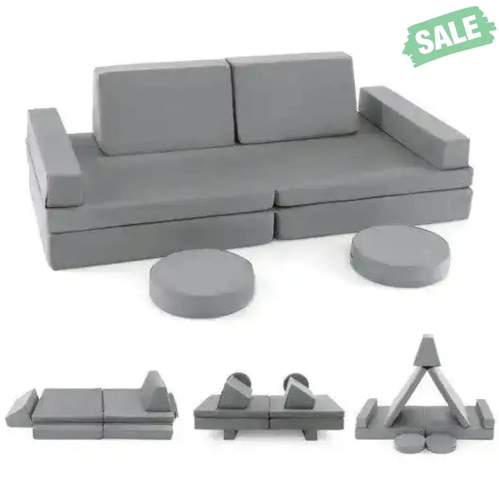 ‚óè 10 Piece Modular Kids Sofa: Consisting of 2 trapezoidal pillows 2 rounded cushions 2 rectangular cushions a thick folding mat and a thin folding mat this 10-piece children's toy set can be easily reconfigured into a sofa a tunnel a fort a car a tent a slide a bed lounge or anything that your kids can imagine.