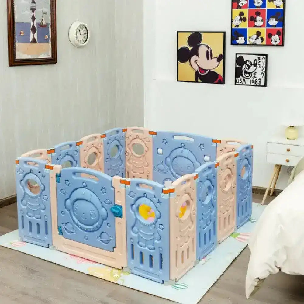 ● Astronaut Pattern with Toy Panel: In order to attract baby’s attention this play fence adopts interesting astronaut design and lovely colour. The toy panel consists of rotating parts which can enhance your baby’s hand coordination while developing visual cognition. Plus this funny baby playpen helps you to keep an eye on your children while working.