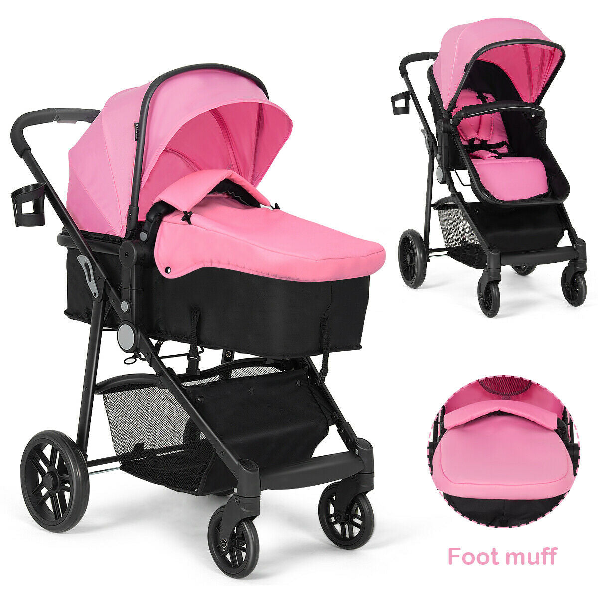 â Brand new and high qualityâ Foot cover can prevent from windy in the winter and can be removed in summerâ Adjustable back rest and handlesâ Five-point harness one key to release quicklyâ Convenient foot brakes for safety and flexibilityâ Foldable design for more convenienceâ Non-toxic and breathable oxford coverâ Basket on the bottom for placing accessoriesâ Sleeping cushion equipped for comfortable sleepingâ Strong construction and light weighted aluminum frameâ Adjustable seats and shed not only can sit but sleep seat also can be two-way conversionâ Fit for babies with the age raging from 0 to 36 monthsâ Note:1. Simple assembly is required according to the included instruction2. Please consider the weight capacity before using3. Please fasten the seat belt when your baby is seated inside