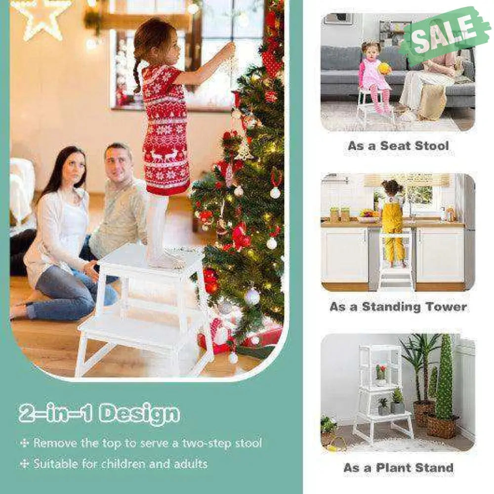 As a step stool it elevates your little one to counter height helping them to independently wash hands prepare food or brush teeth. Besides it can also serve as a plant display rack for storage and a seat bench for relaxing. To better protect kids' safety it features four-sided safety rails and spacious platform. When not in use you can detach the top rails. In addition safe pine wood material burr-free surface and odorless painting also ensure excellent security. And it has passed ASTM certification. On the other hand with A-shape structure reinforced crossbar and screw connection it's strong stable and not easy to wobble.