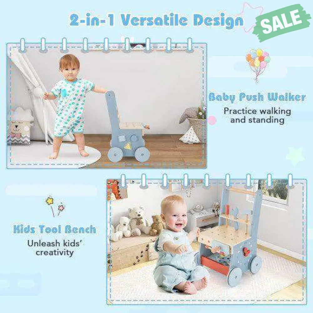 ● 2-in-1 Versatile Design: This delightful baby push walker can transform into a vibrant kids tool workbench which includes various tiny tools such as screwdriver hammer and wrench. Such a 2-in-1 design is perfect for little ones to switch between practicing walking and standing and unleashing hand-on stability imagination and creativity.