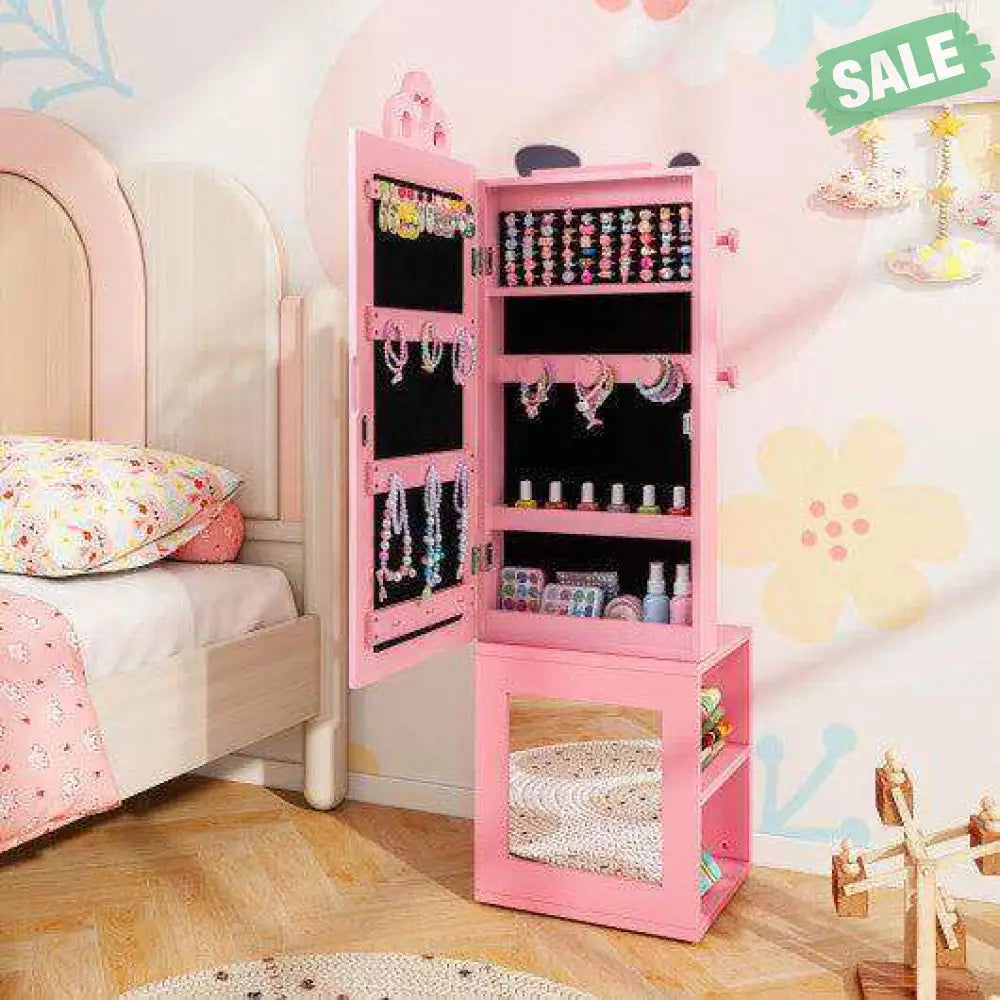 ‚óè Versatile 3 In 1 Design: Designed to meet all your little one's fashion needs this kids jewelry cabinet blends a full-length mirror and clothes rack. Featuring cute heart-shaped cut-outs it is not just a piece of furniture but also a charming decoration that suits any girl's bedroom.