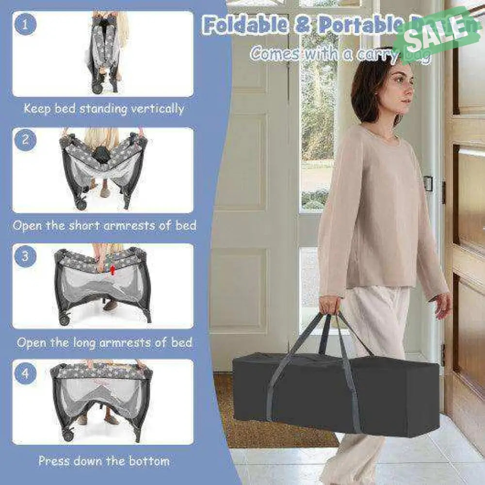 ‚óè Easy Folding and Carrying: This foldable and portable baby playard comes with a carry bag for traveling storage and more. The unfolding process is effortless without tools: keep the bed standing vertically; open the short armrests of bed; open the long armrests of bed; press down the bottom.