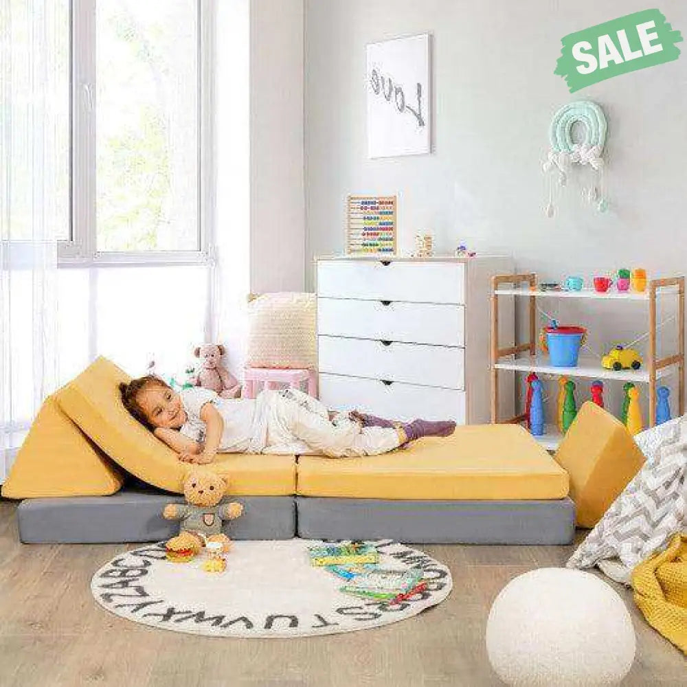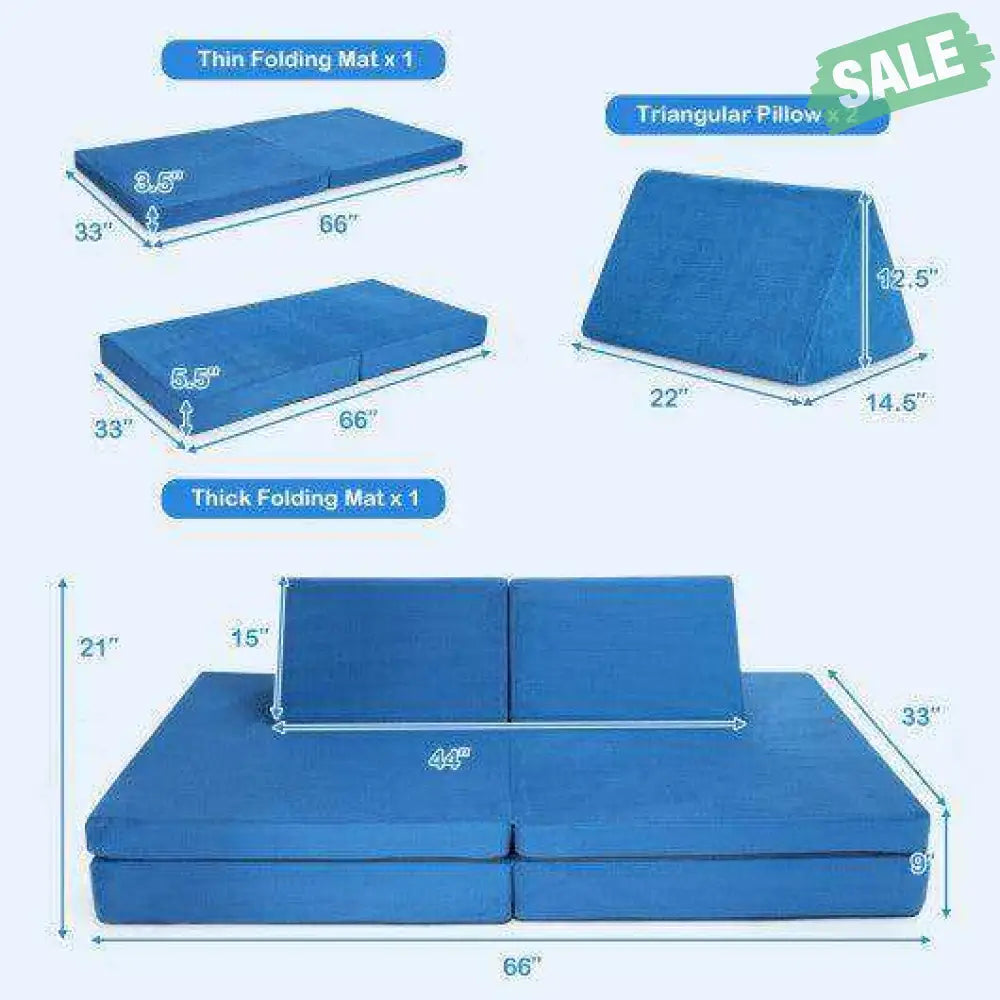 ● 4-Piece Convertible Sofa and Play Set: This 4-piece kids' playroom furniture includes 2 folding mats and 2 triangular pillows which can be used separately or combined. Toddlers or teens can convert the sofa into a playhouse rocket ship tunnel bed 2 chairs and more to meet various needs for playing climbing watching TV or just relaxing.