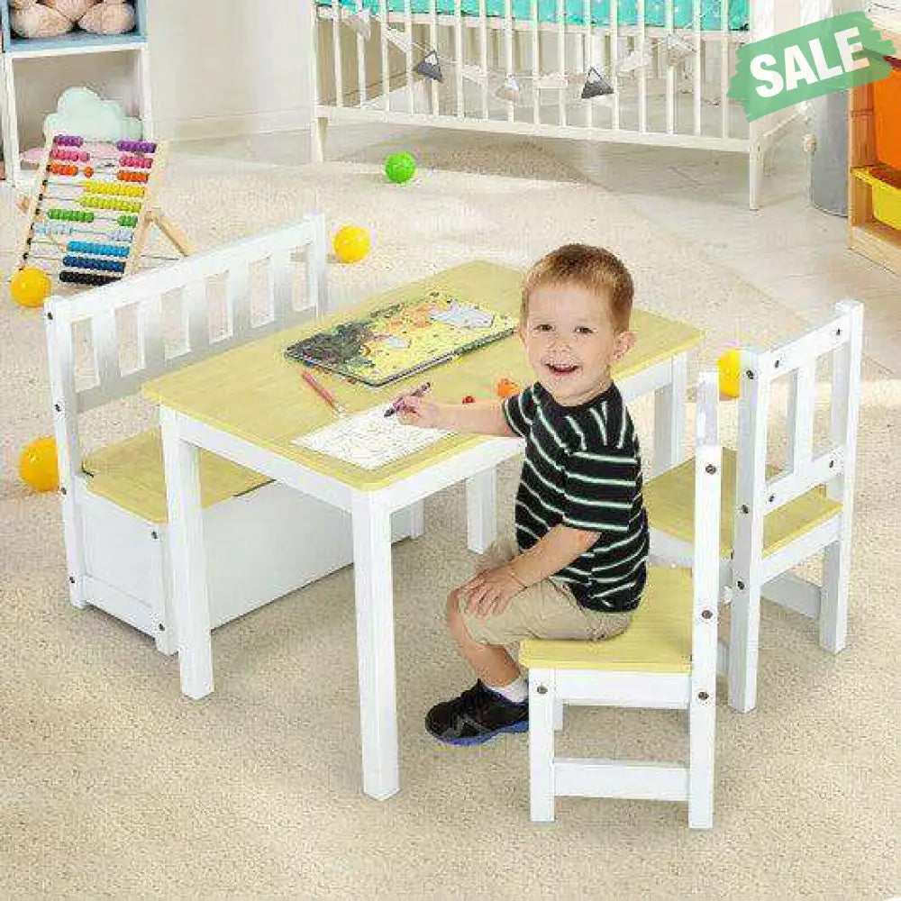 - The set includes a table 2 chairs and a storage bench can accommodate 3-4 children at the same time