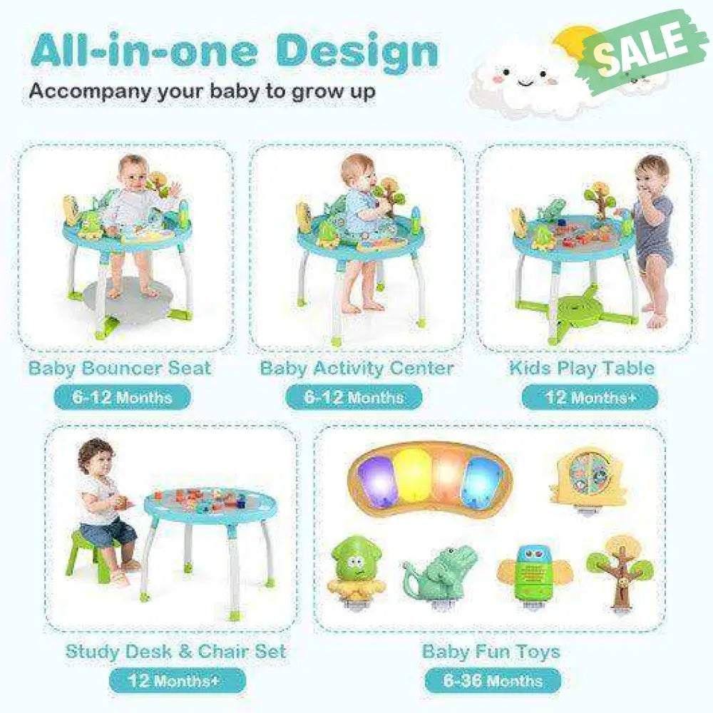 -All-in-one design: bouncing activity saucer(6-12 months) activity center(6-12 months) play table(12 months+) or study desk & foldable chair(12 months+)