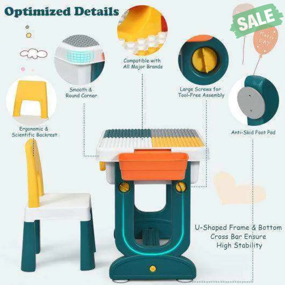 - Multifunctional Double-sided Board: One side of this table board is compatible with any blocks to cultivate kids' hands-on skill and creativity. The other side is smooth for dinner and reading. Most importantly your kids would enjoy drawing on tilting board as it can be lifted up with stand. Pencil box is built inside the table.