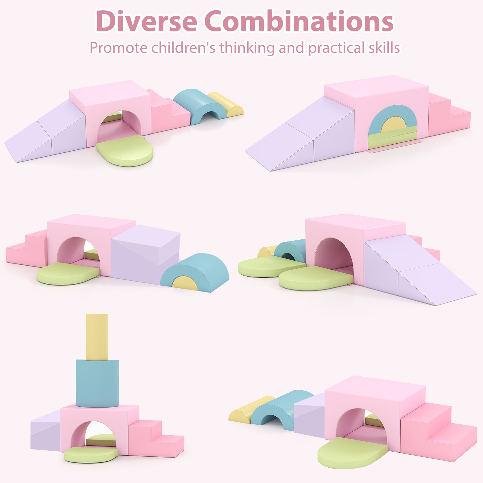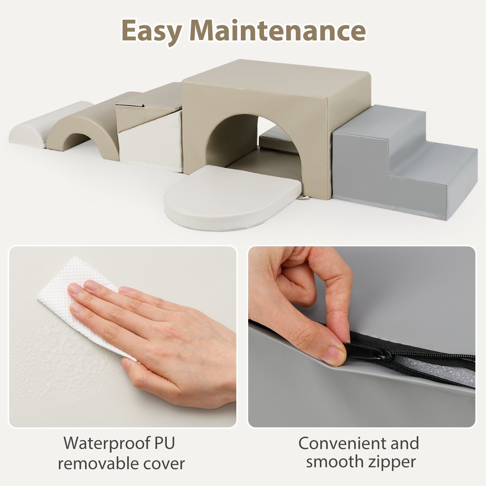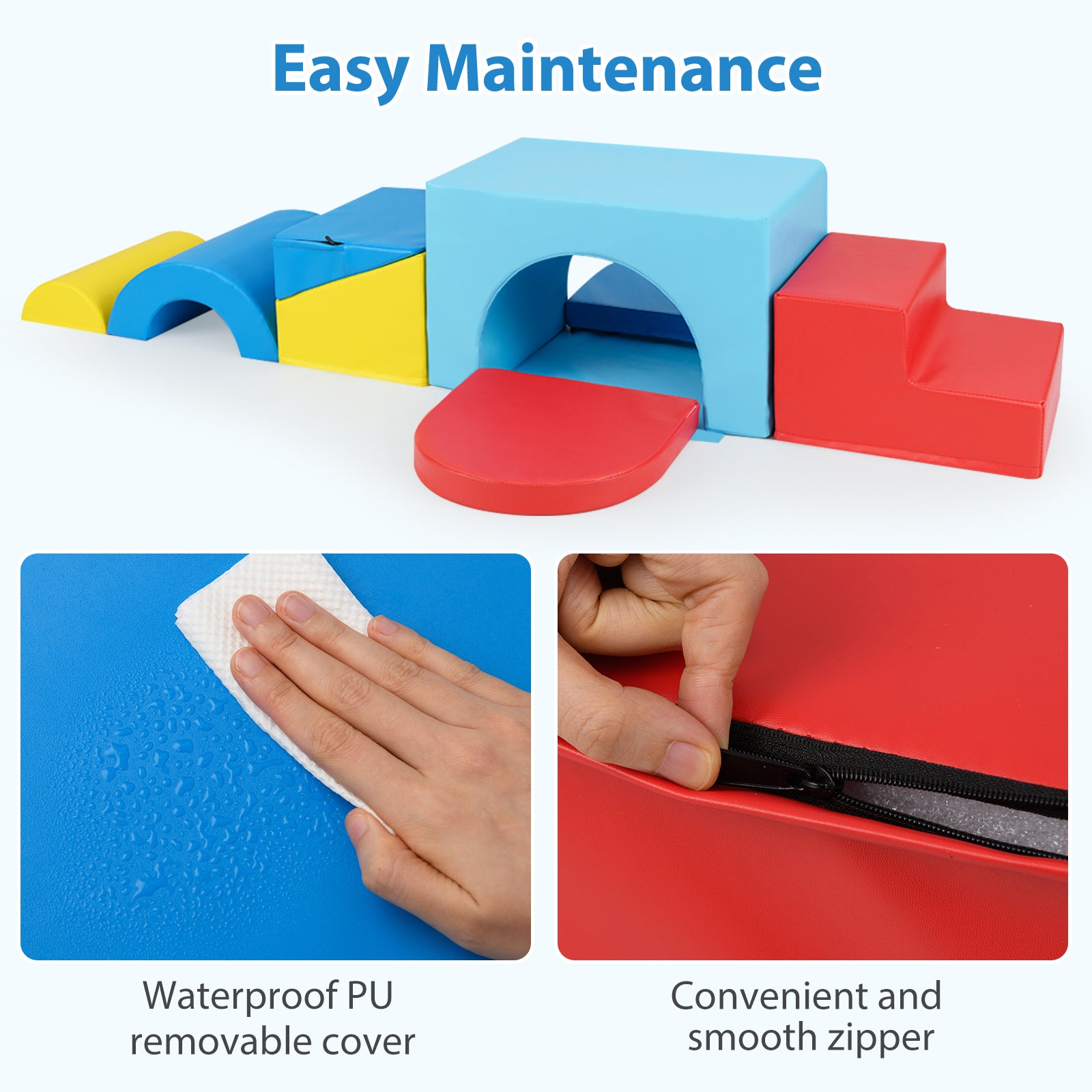 â Child-safe soft play set is perfect for 1+-year-old kidsâ Skin-friendly PU leather requires easy careâ High-density EPE foam offers a soft touchâ Reinforced stitches ensure enduring qualityâ Smooth zippers enable you to remove the cover for easy cleaningâ Hook-and-loop fasteners allow you to firmly connect the blocks togetherâ One piece for versatile use make it suitable for various scenesâ Reversible tunnel block and folding wedge block bring added funâ Suitable for energetic explorers crawling climbing sliding and building blocksâ Endless combination possibilities to adapt to different needs and room's layoutsâ Ideal gift for your little ones to boost creativity and develop recognition