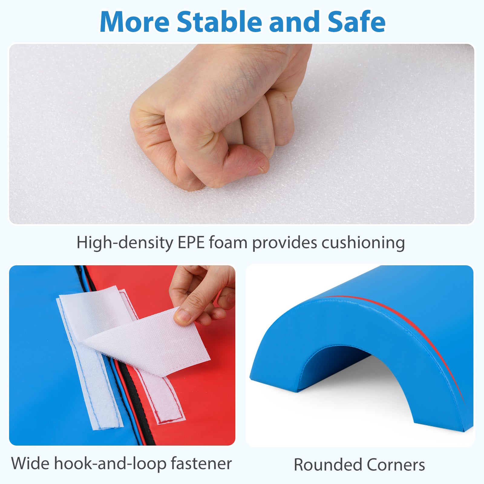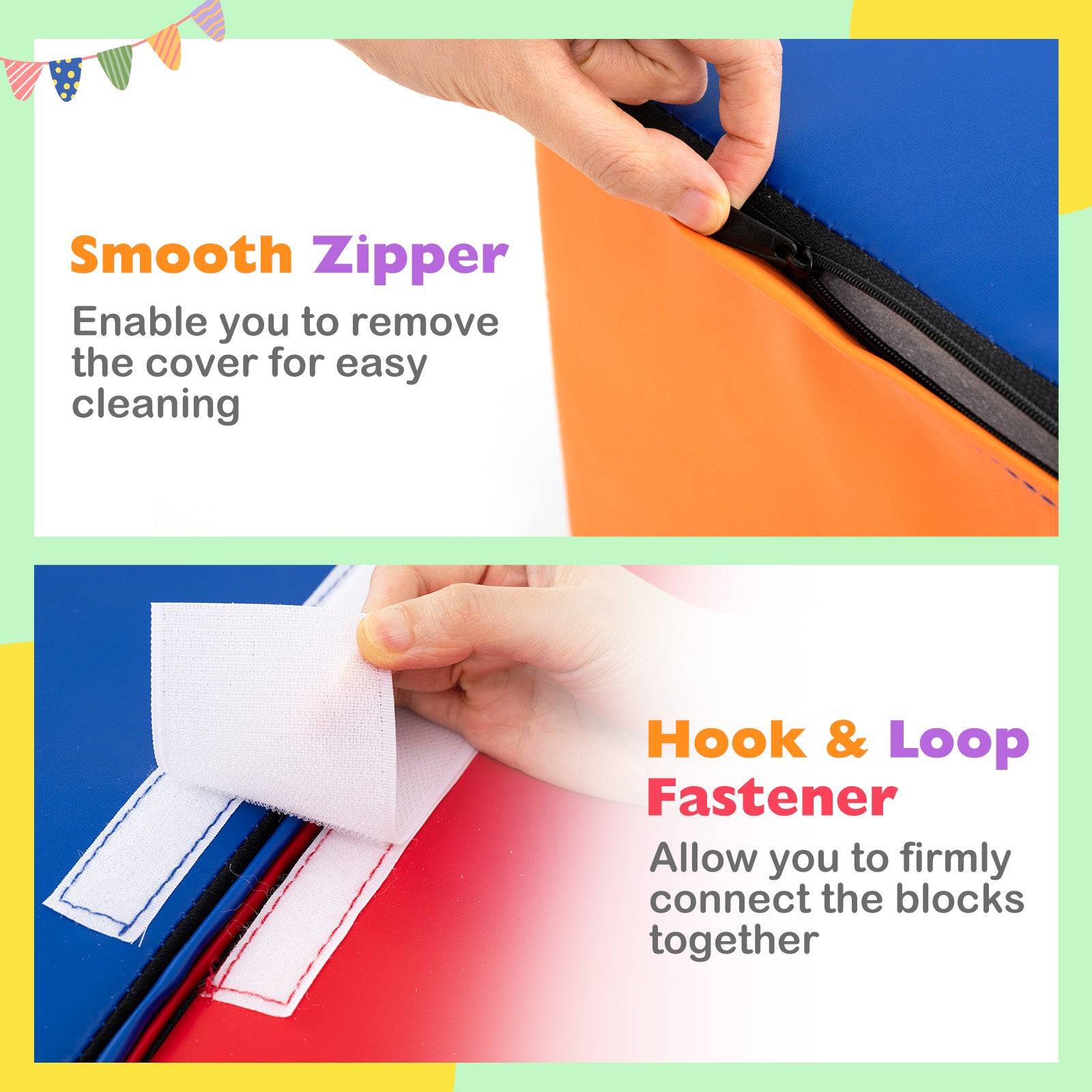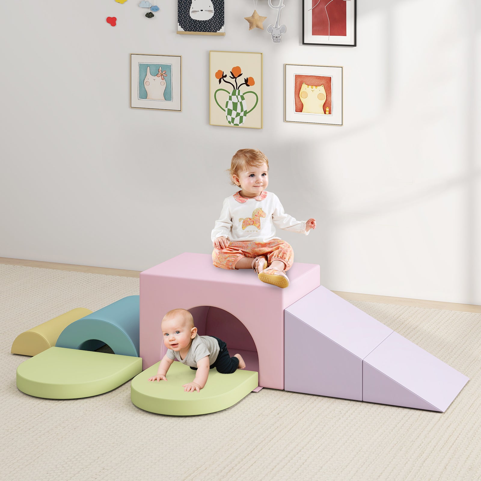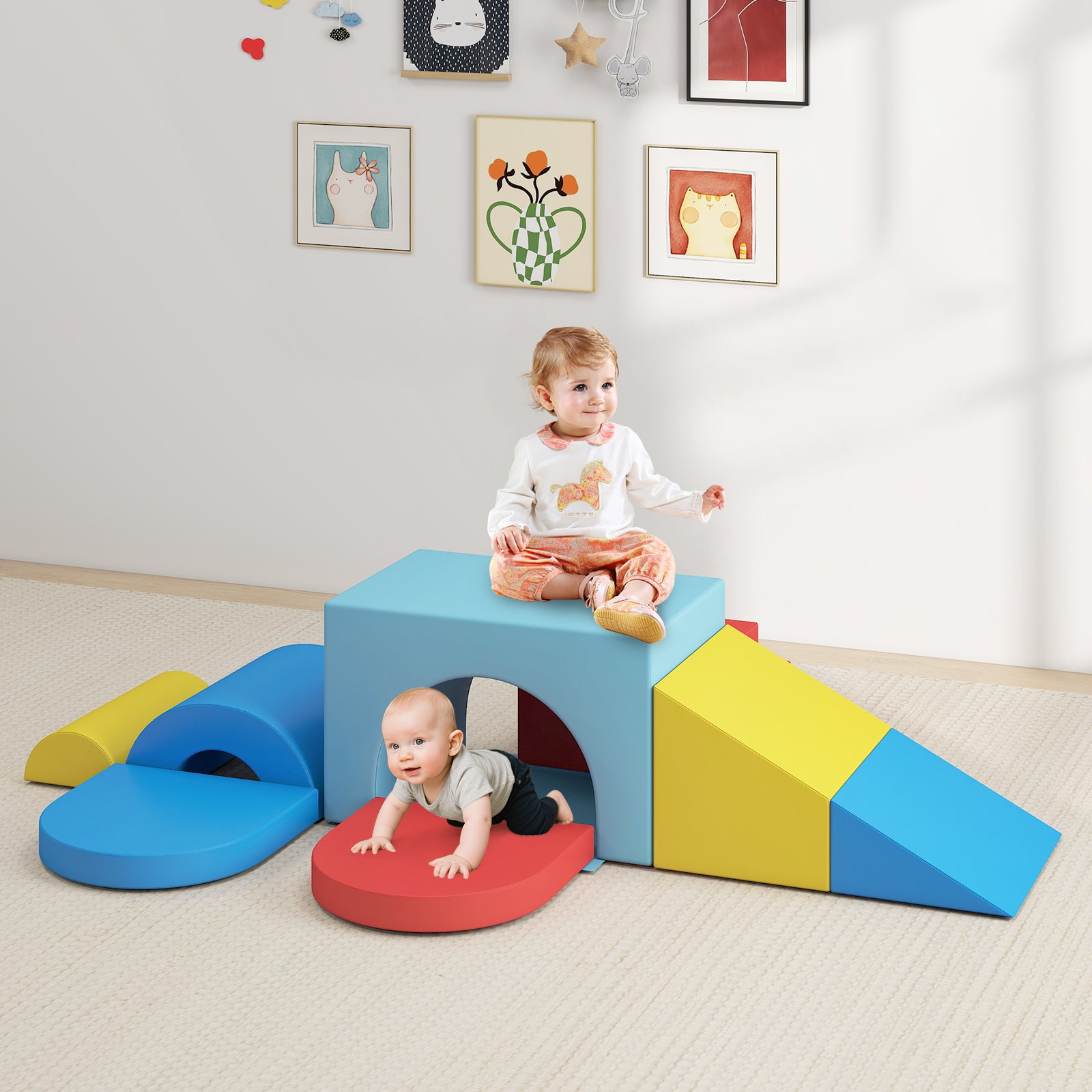 â Child-safe soft play set is perfect for 1+-year-old kidsâ Skin-friendly PU leather requires easy careâ High-density EPE foam offers a soft touchâ Reinforced stitches ensure enduring qualityâ Smooth zippers enable you to remove the cover for easy cleaningâ Hook-and-loop fasteners allow you to firmly connect the blocks togetherâ One piece for versatile use make it suitable for various scenesâ Reversible tunnel block and folding wedge block bring added funâ Suitable for energetic explorers crawling climbing sliding and building blocksâ Endless combination possibilities to adapt to different needs and room's layoutsâ Ideal gift for your little ones to boost creativity and develop recognition