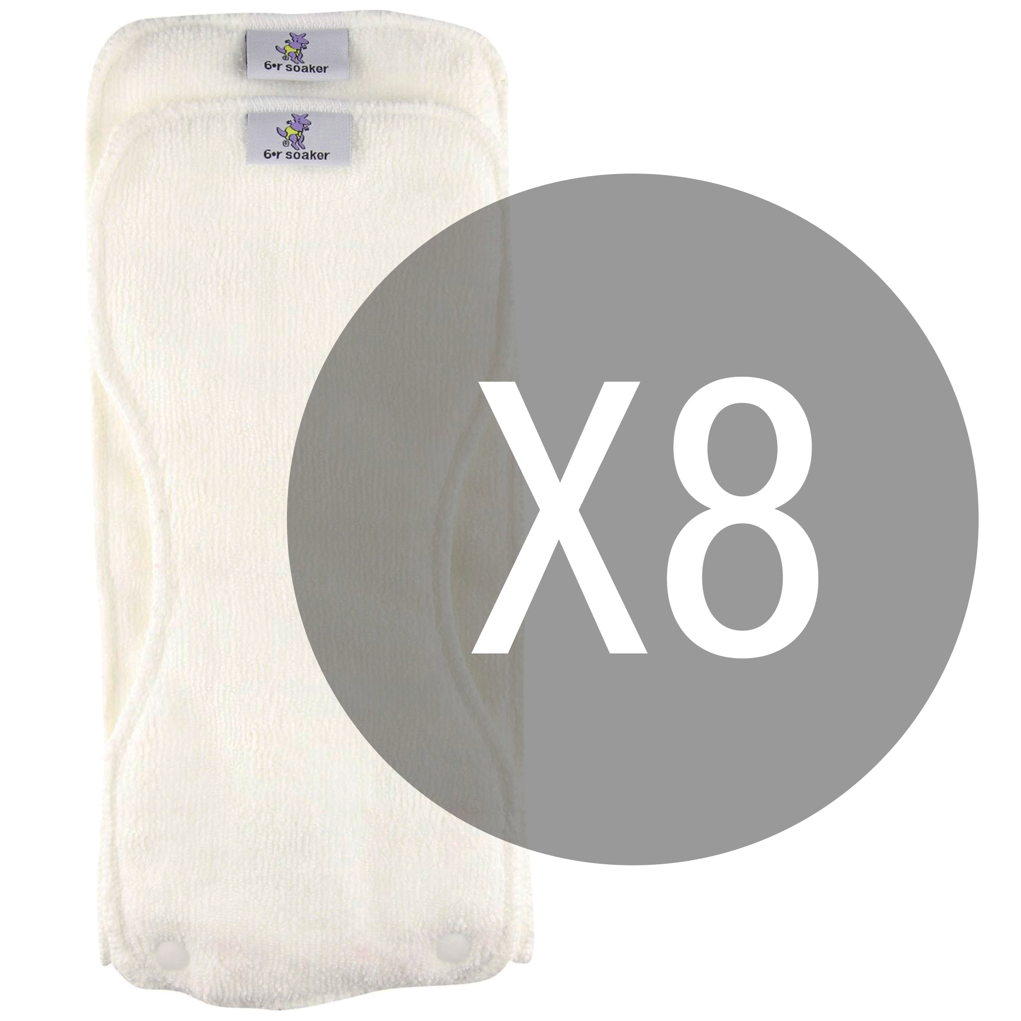Bundle up and get 16 individual inserts (8 one-size, 8 newborn), for a total of 8 sets of our gold standard Microfiber 6r Soaker insert. This bundle is perfect for adding a few more insert sets to maximize the dozens of ways that you can customize the absorbency level with your 6r Soakers. This bundle is also idea if you need to replace cheap, ineffective inserts that came with a different brand diaper. Each microfiber layer, soft as a cloud, boasts a quick-absorbing 350 GSM quality. With seven layers, it totals 2,450 GSM absorbency. The Rumparooz 6R Soaker, designed to complement the Rumparooz One Size Cloth Pocket Diaper, offers extensive size and absorbency customizations. This versatility makes it perfect for replacing any old insert and suitable for any brand of pocket diaper.