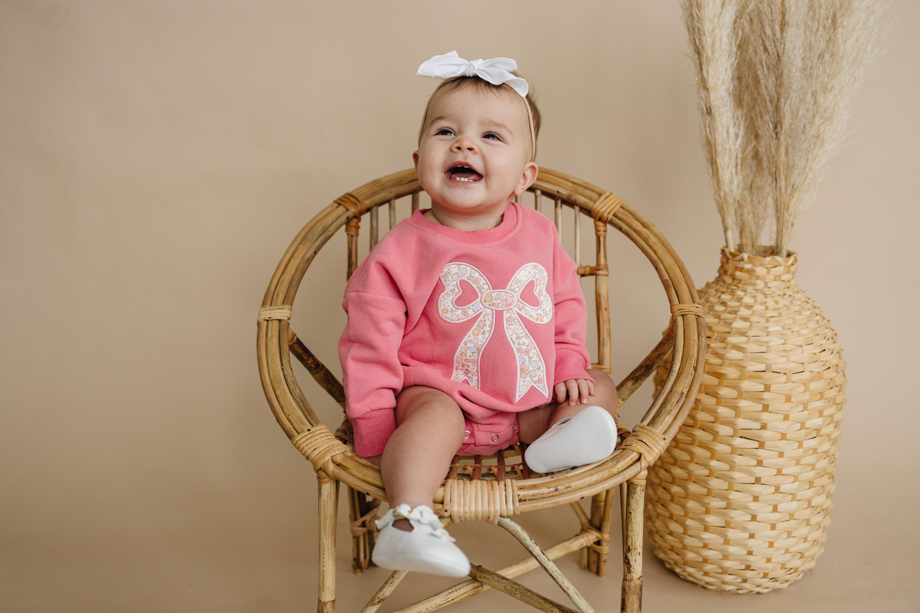Get out of the winter blues with our Applique Floral Bow Sweatshirt Romper! This sweatshirt features a charming, embroidered bow applique design, bringing a cozy and cheerful vibe to your cold weather wardrobe. Made from a soft, high-quality fabric, it offers warmth and comfort for all your activities, from family gatherings to cozy days at home. The classic crewneck style and relaxed fit make it easy to layer over your favorite tops or wear alone, while the eye-catching design adds a touch of seasonal flair.