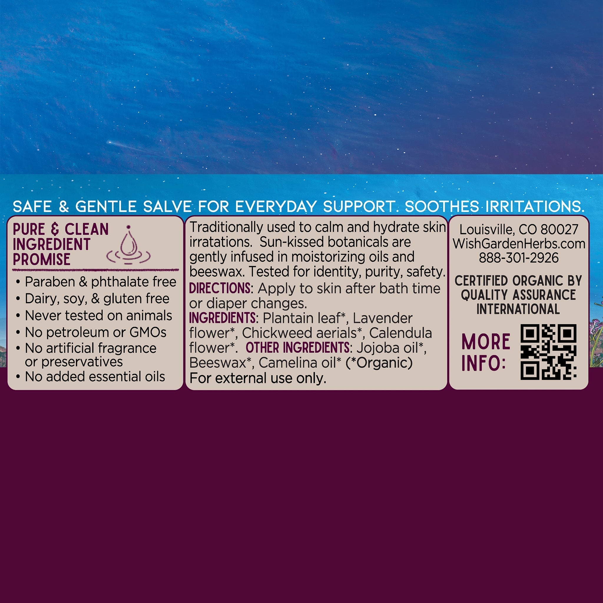 Organic Plantain leaf (Plantago spp.,) organic Lavender flower (Lavandula officinalis, L. intermedia, L. angustifolia), organic Chickweed aerials (Stellaria media), organic Calendula flower (Calendula officinalis), organic Jojoba oil, organic beeswax, organic Camelina oil.