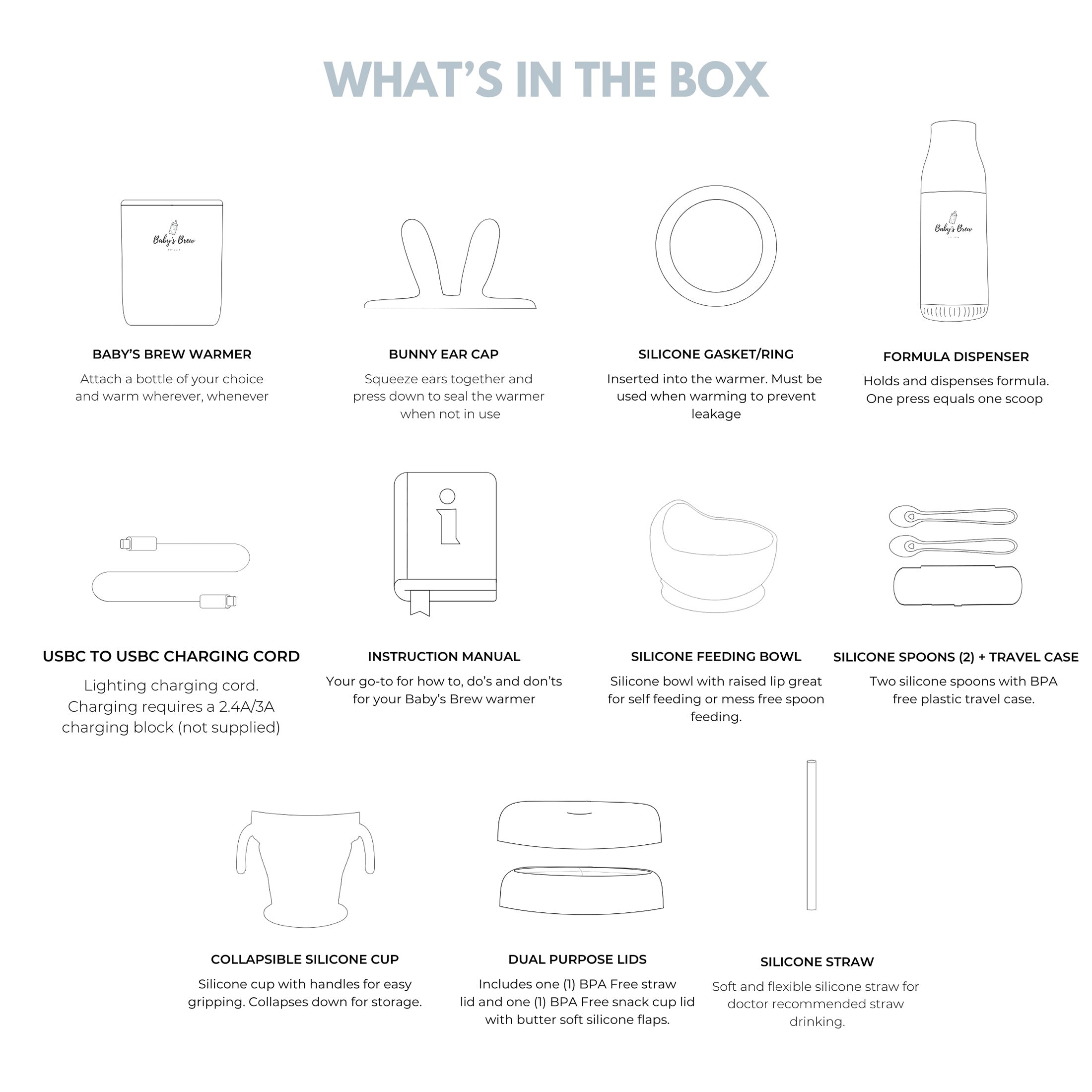 Baby's Brew Warmer and Formula Dispenser Set: A revolutionary product that ensures the perfect bottle temperature anytime, anywhere. The formula dispenser makes preparing bottles quick and easy, whether at home or on the go.