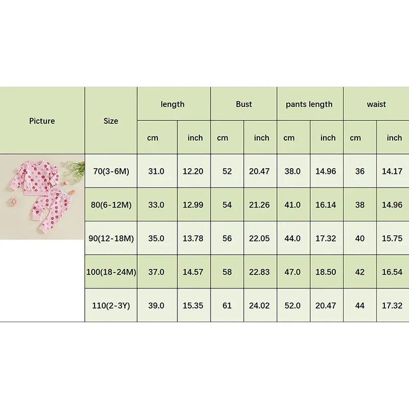 110 Tops Length: 15.35 Bust: 24.02 Pants Length: 20.47 Waist: 17.32 Advised Age: 2-3 Years