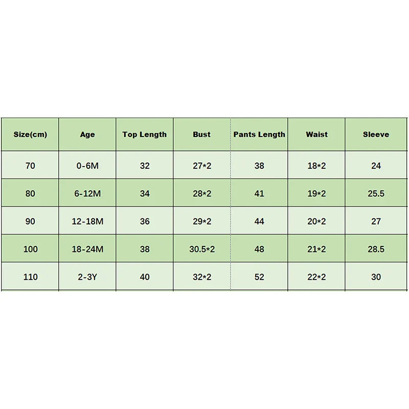 70 Tops Length: 12.6 Bust: 21.26 Sleeve: 9.45 Pants Length: 14.96 Waist: 14.17 Advised Age: 0-6 Months