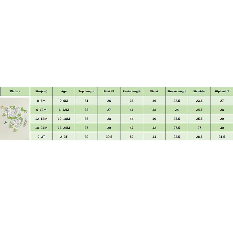 70 Tops Length: 12.20 Bust: 20.47 Sleeve: 8.86 Shoulder: 9.25 Pants Length: 14.96 Waist: 14.17 Hip: 21.26 Advised Age: 0-6 Months