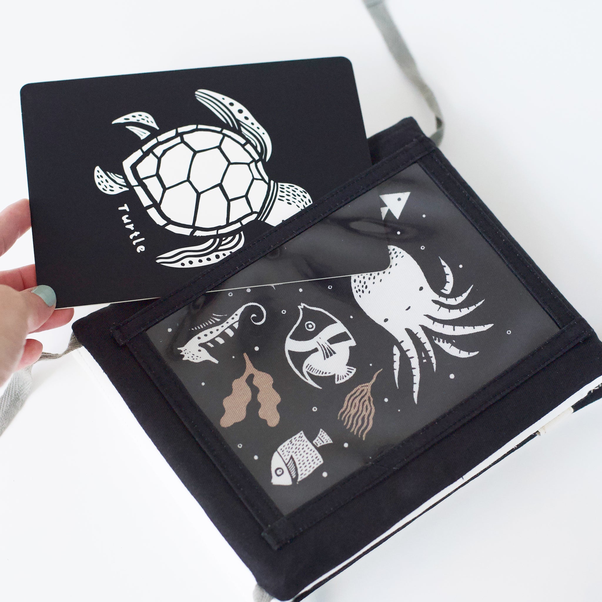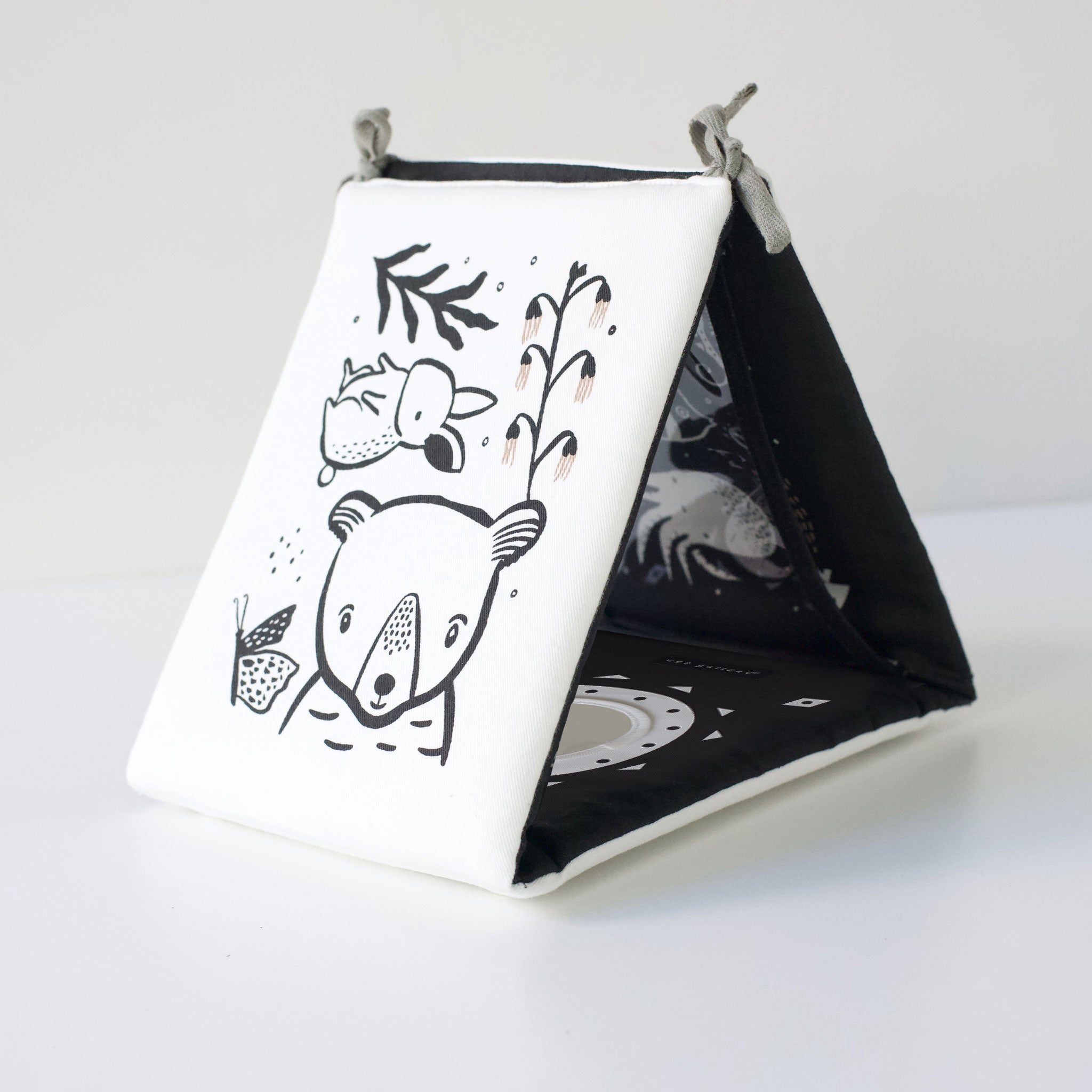 This tummy time toy was created especially to help babies from newborn up to the first year engage and develop a wide range of senses and motor skills. With the allure of a soft book, plus textured embroidery and pockets where the images can be switched out with various Art Cards. The gallery can be laid flat with a light or dark black and white side, or it can be tied together for form a 3D triangle, so that baby can enjoy tummy time play on their own and can look at it while laying down, pushing up, or in a seated position.