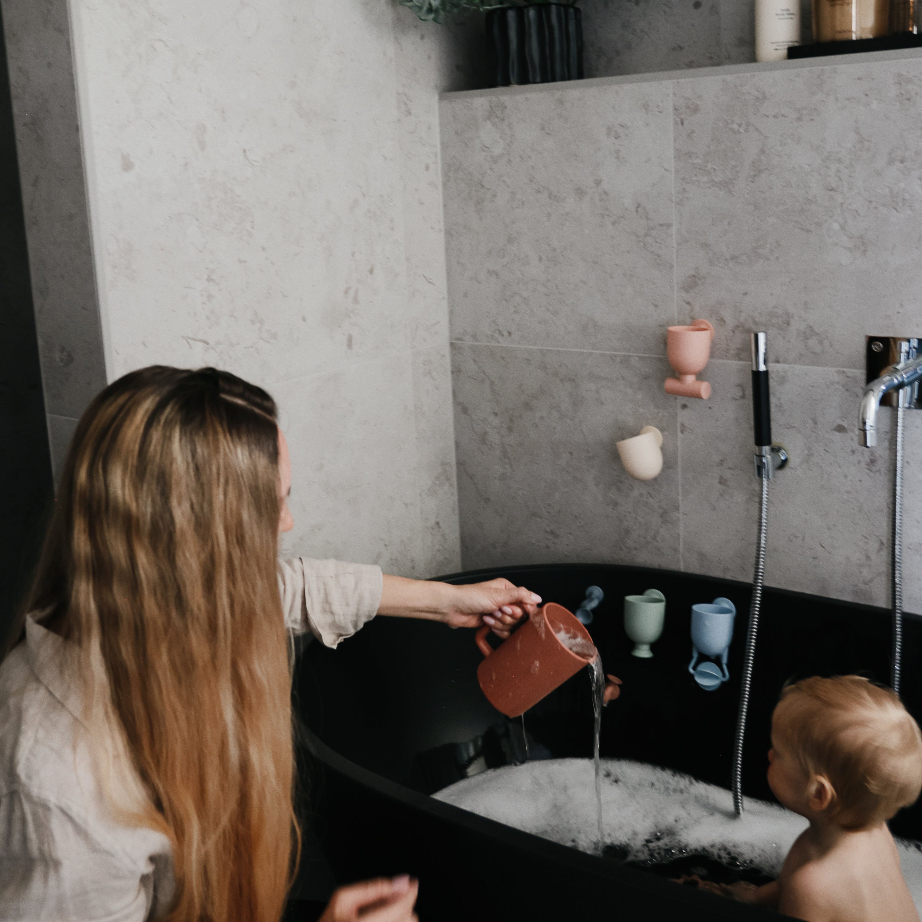 Made from food grade silicone and featuring calming colors, the Mushie bath rinse cup helps children enjoy bath time and end the day extra clean.