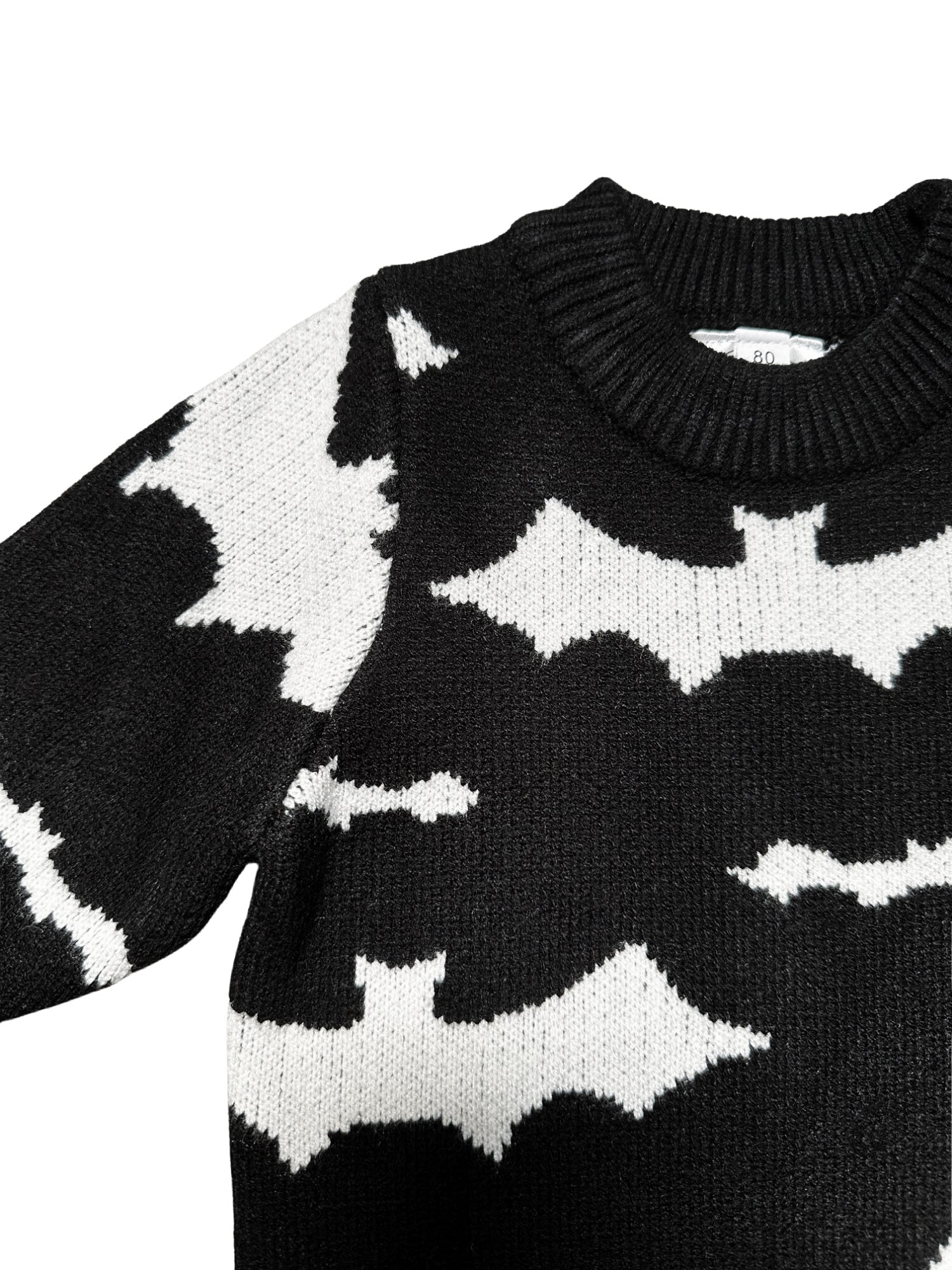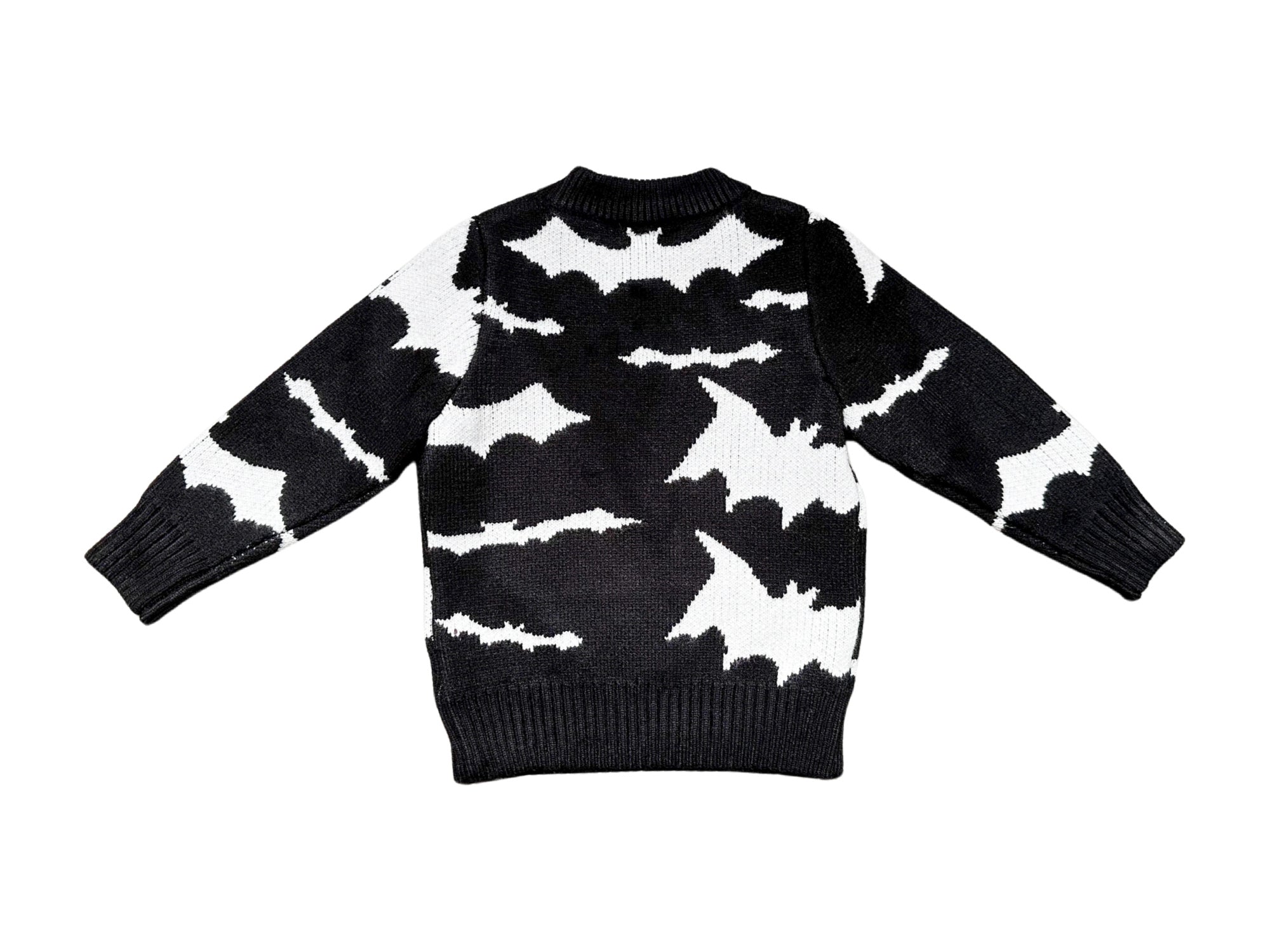We are SO excited to have this special black/white bat print sweater we designed for our Witching Hour Baby exclusive line. This crewneck-style sweater features dynamic white bats all over and black, ribbed contrast cuffs. Made of 44% Viscose, 28% Nylon, 28% PBT.