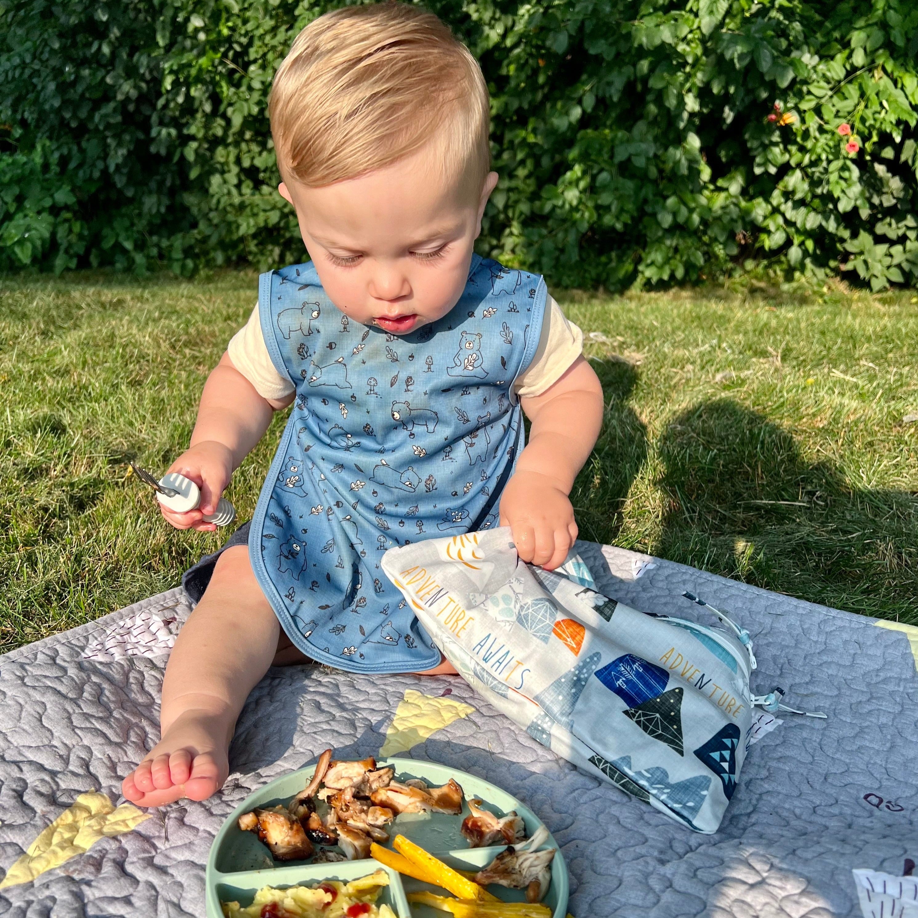 This best-selling “Bapron”, also known as a bib-apron hybrid, full-coverage bib, smock, or apron, is designed for comfort and safety. Because of their comfortable, secure-fitting horizontal ties and their full-coverage design, Baprons are the perfect companion for mealtime, art, and sensory play!