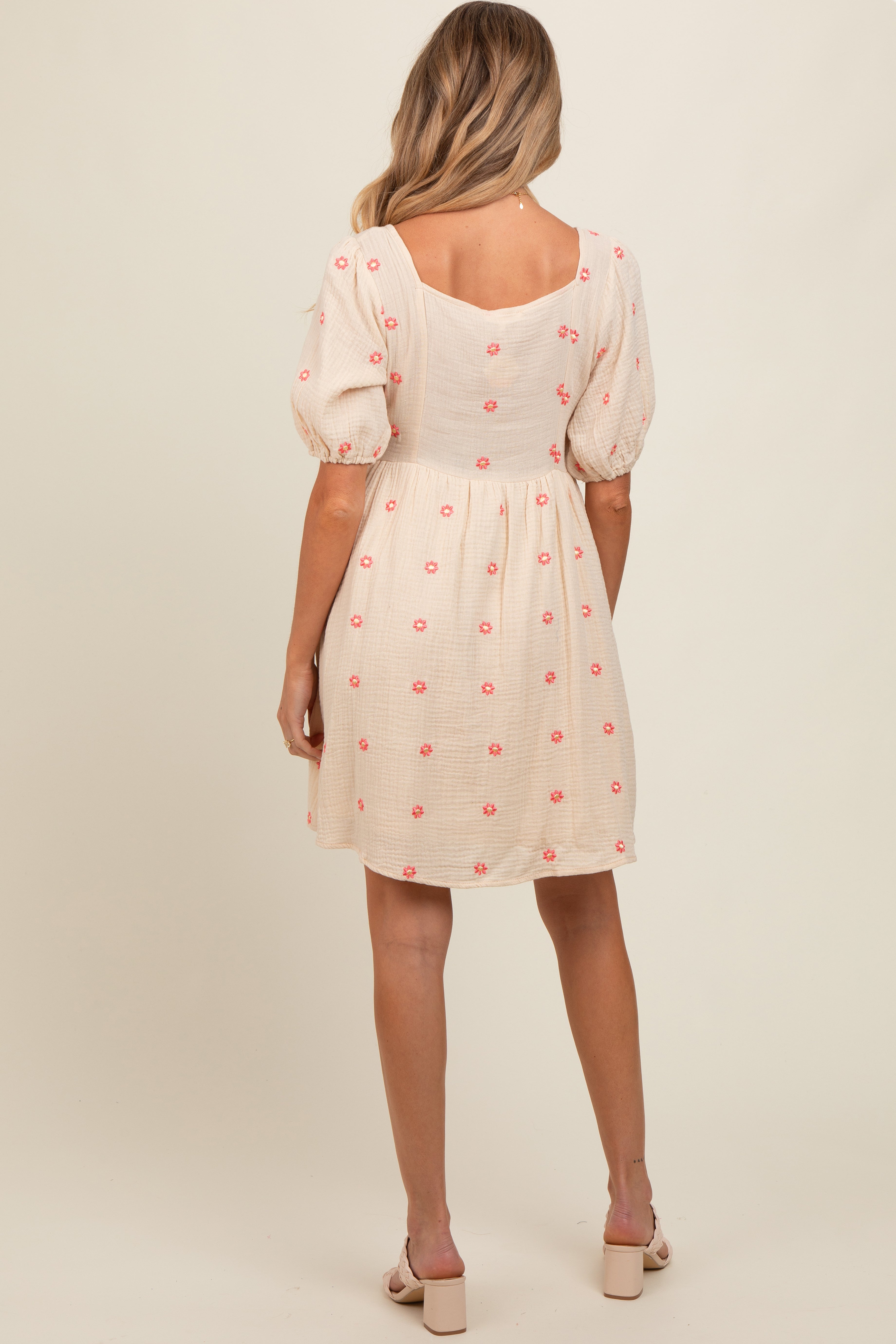 - Beige Floral Embroidered Button Front Short Sleeve Maternity Dress