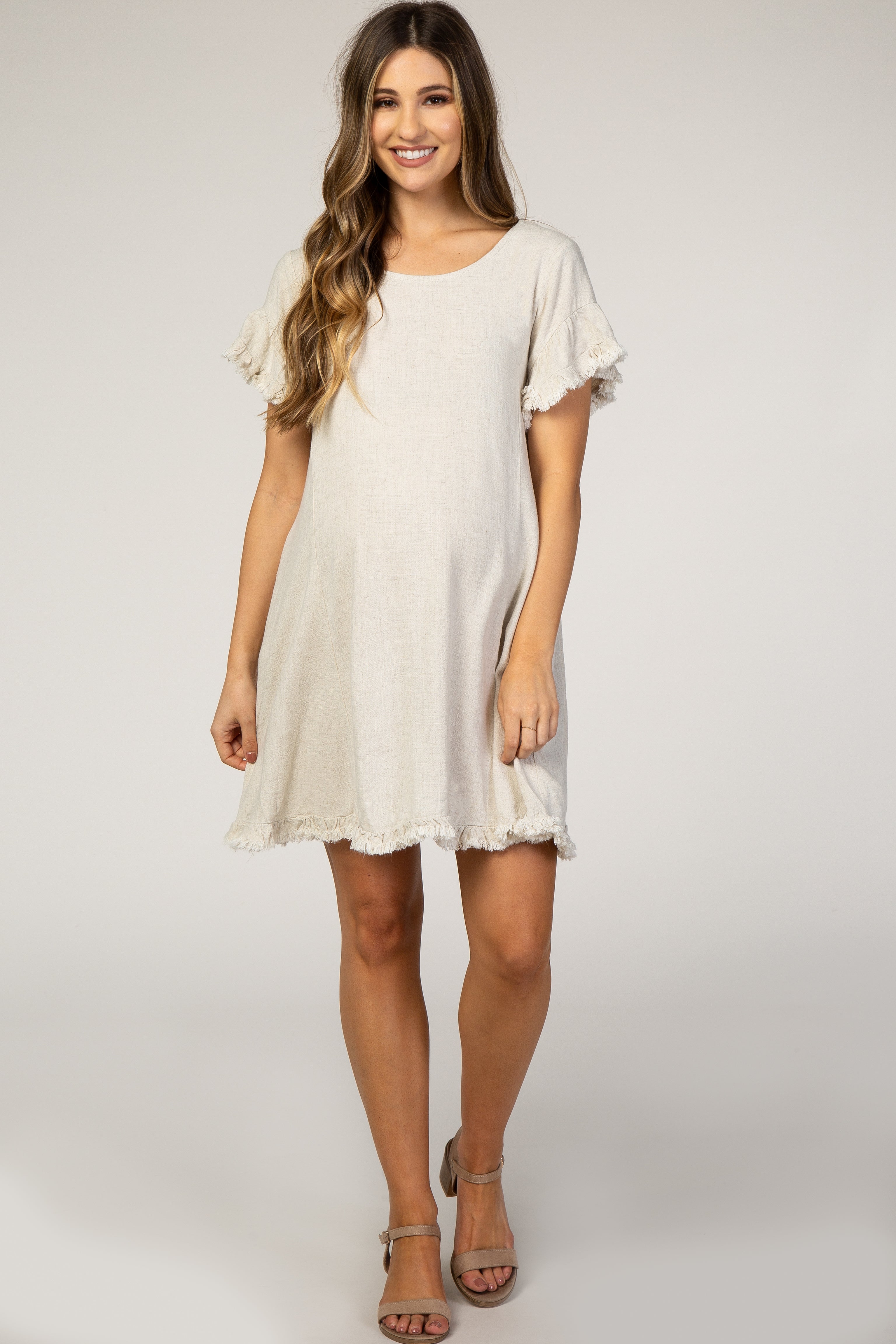 - Beige Fringe Linen Maternity Dress