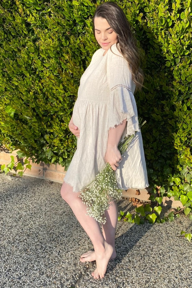 Soft, sophisticated, and effortlessly chic—the Raw Edge Bell Sleeve Babydoll Maternity Dress is your new go-to for comfort and style. Made with a flowing babydoll silhouette, this dress flatters your growing bump while offering plenty of room to move. The bell sleeves with raw edge details add a touch of boho flair, perfect for brunches, showers, or casual days out. Lightweight fabric keeps you cool, while the elegant neutral shade pairs easily with your favorite sandals or boots. Dress it up or down for versatile, all-day wear throughout your pregnancy and beyond!