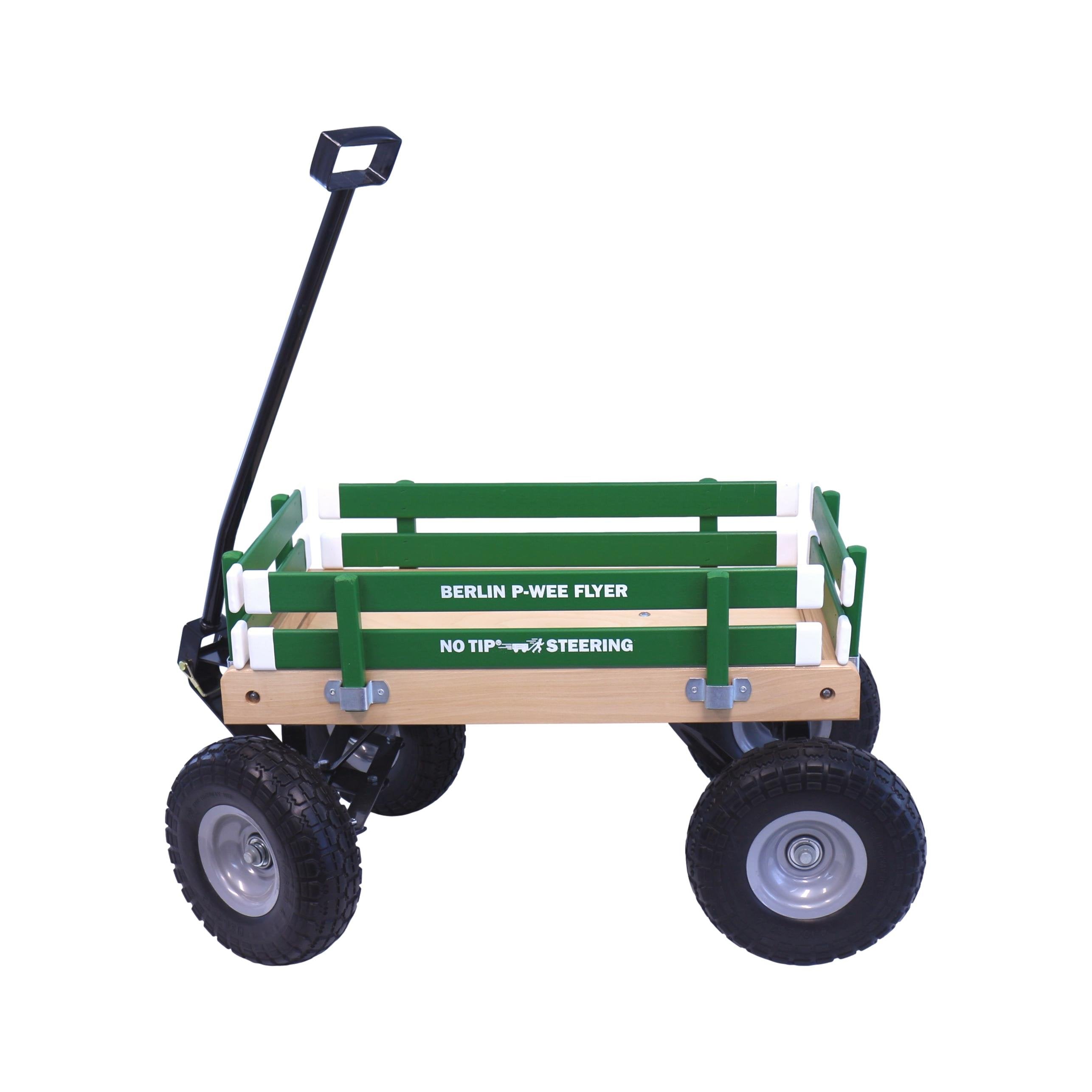 Berlin Flyer Wagons is an Amish and Mennonite owned and operated business in Holmes County, Ohio. These popular express wagons are made right here in Ohio using locally-sourced, solid hardwoods and steel, and all parts (except the wheels) are manufactured in-house. Each Berlin Big Foot Wagon is made with a solid wood bed, painted hardwood side rails that are easily removed, and an all-steel frame that is welded and powder-coated. Finally, the express wagon is finished with a non-toxic paint and varnish for your peace of mind. The Berlin F300 wagon comes with 10" x 3" foam-filled tires and the wagon bed (outside measurement) measures 25" x 14". Easy assembly (approximately 5-10 minutes) is required and detailed assembly instructions are included. The Berlin Big Foot Wagon weight capacity is rated for up to 150 Lbs. Choose between 7 flashy colors: Red, Emerald Green, Orange, Purple, Hunter Green, Pink, and Blue.