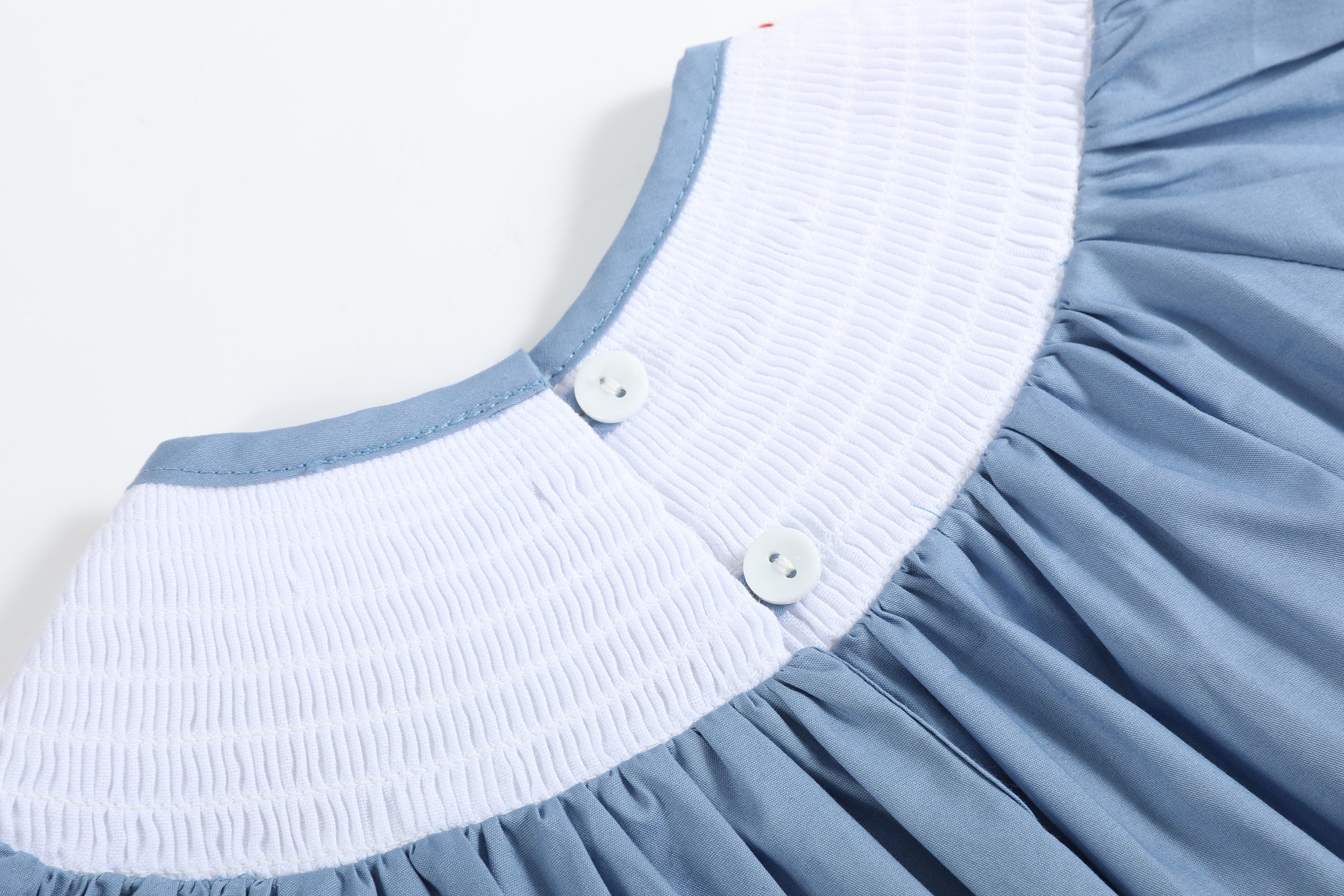 Farmyard fun for your darling girl! Our Blue Farm Animals Smocked Romper is the perfect blend of adorable and practical. The smocked neckline showcases beautifully embroidered farm animals, adding a touch of countryside charm. Designed with convenience in mind, it features snaps at the crotch for quick diaper changes and back buttons for easy dressing. Available in sizes up to 2T, it’s ideal for infants, babies, and toddlers ready for farm-themed adventures!