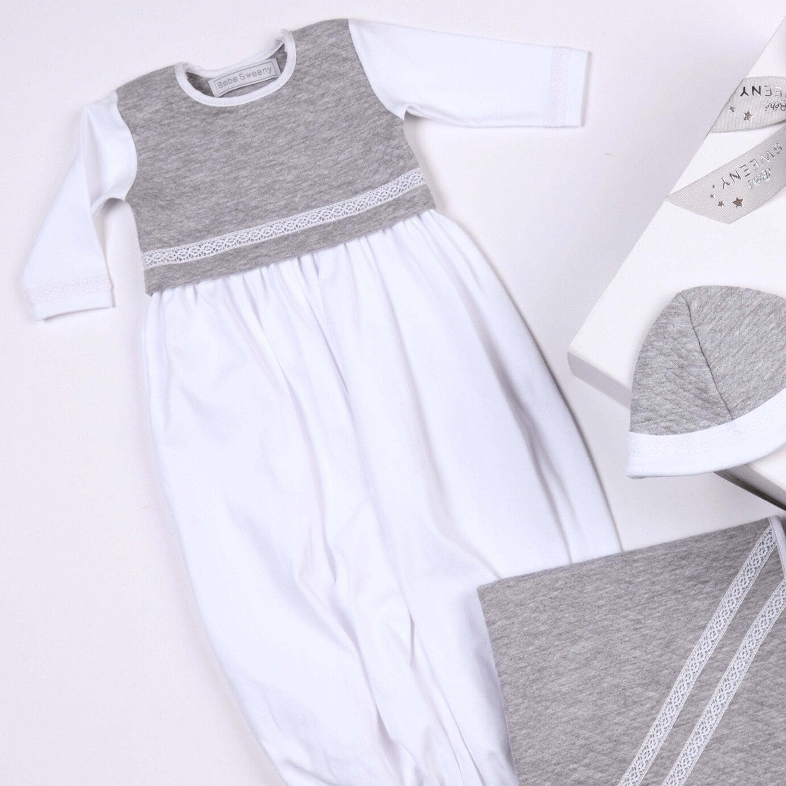 A lovely white and grey ceremony gown for baby boys made in soft cotton. The white lace accent adds a subtle special detail and the quilted cotton in a lovely shade of grey is as stylish as comfortable. This baby gown is functional with an elasticated hem and keeps baby covered while also allowing easy diaper changes. The matching grey blanket and hat are also available to complete this outfit that is as sweet as he is. It also makes a perfect bris outfit.