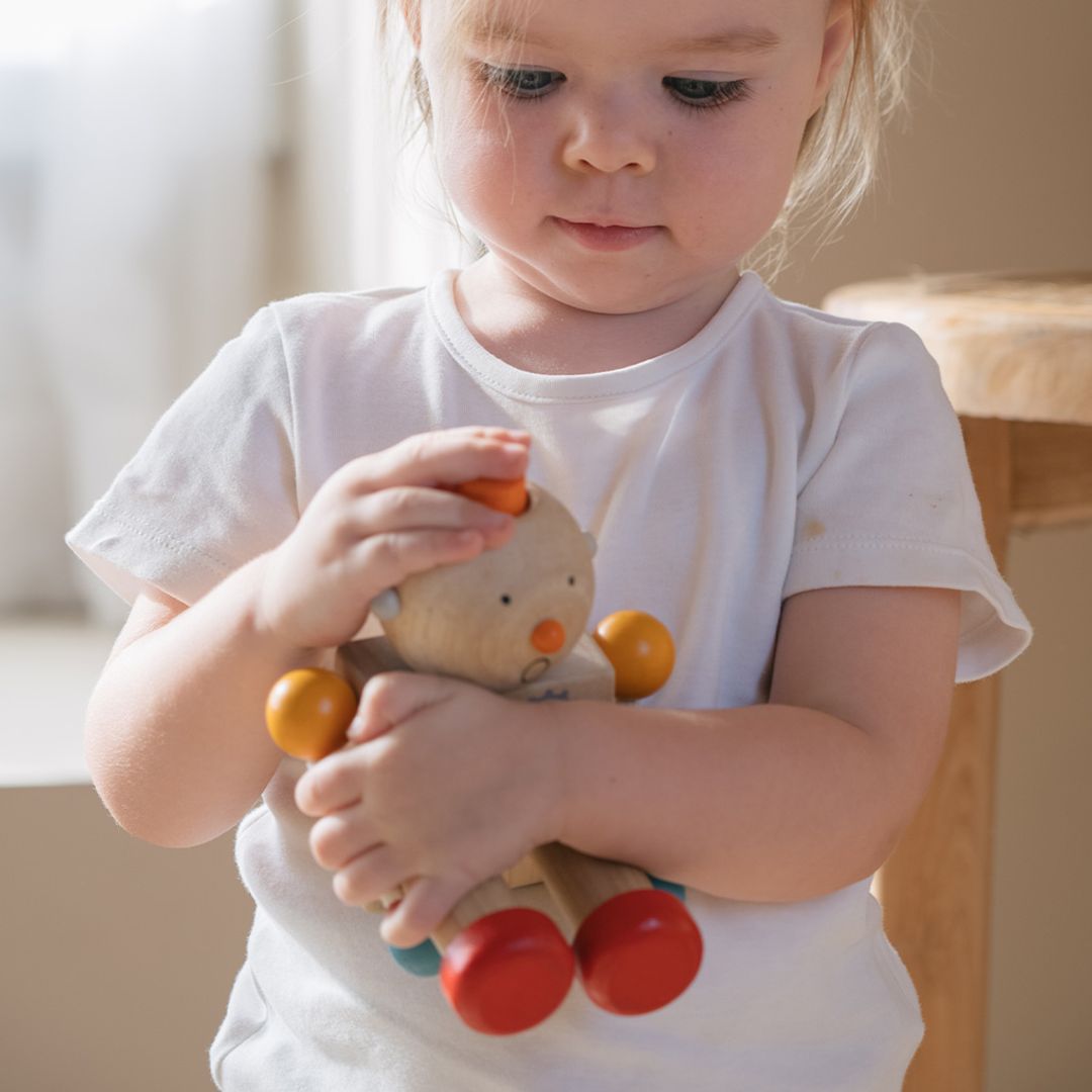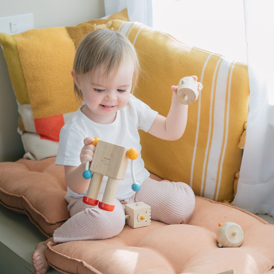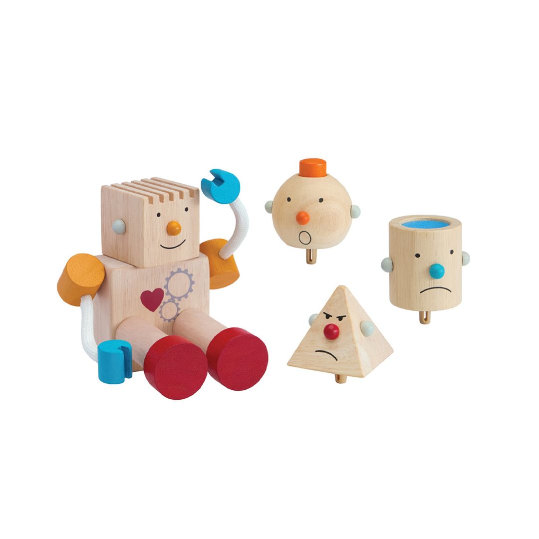 This charming robot features four interchangeable heads, which teach emotions and offer different tactile & auditory experiences. Legs are movable for standing or sitting.