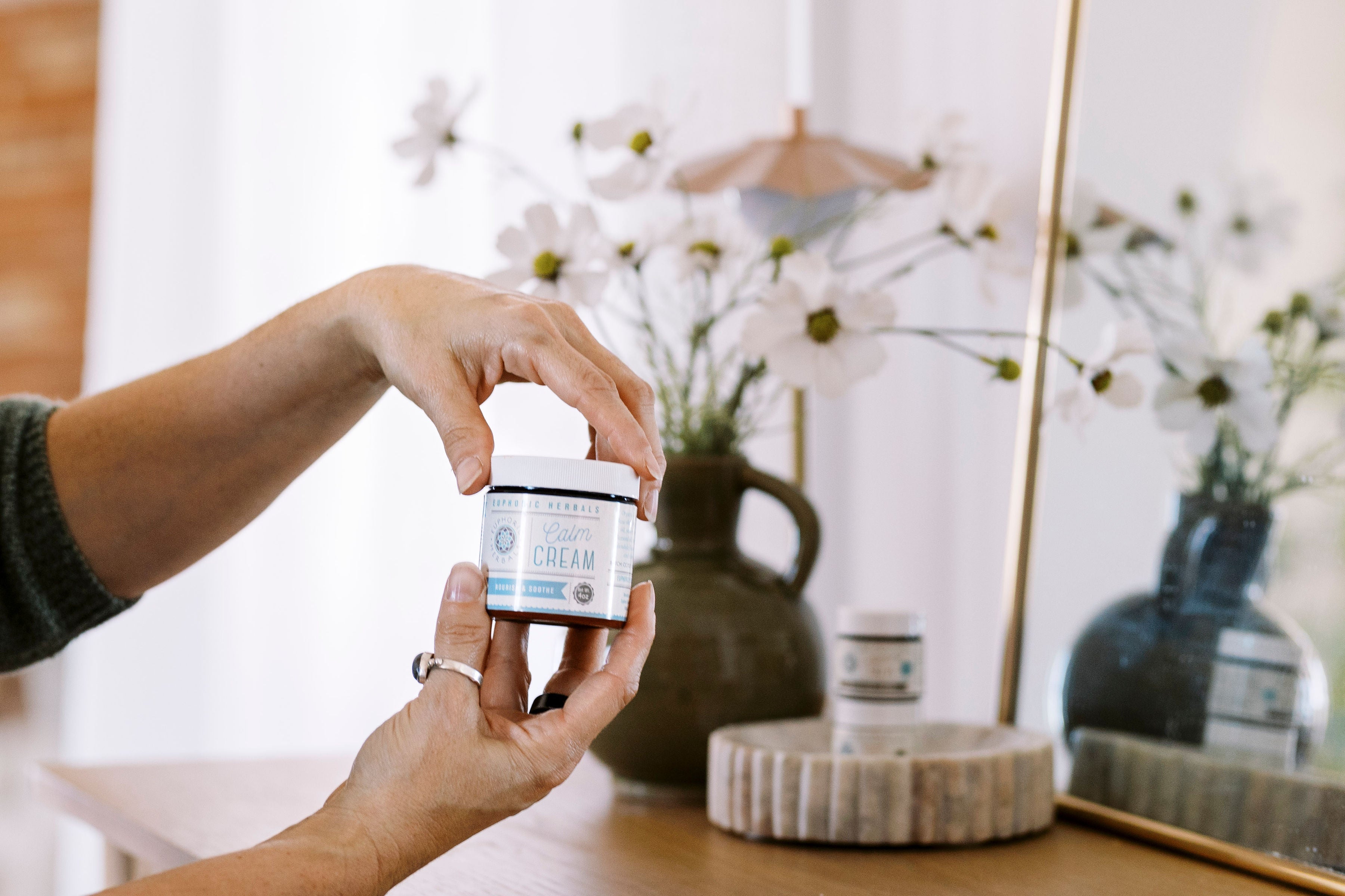 The secret to Calm Cream's remarkable texture and effortless absorption lies in the skillful addition of beeswax. This natural ingredient imparts a luxuriously smooth consistency, allowing the cream to glide effortlessly onto your skin, melting away tension and nourishing every pore.
