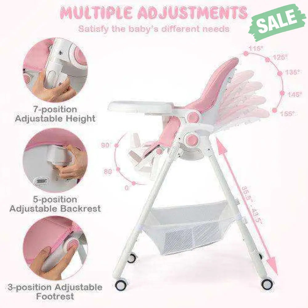 ● Adjustable and Multifunctional Design: This baby high chair boasts 7-posiiton adjustable height (35.5"-43.5") 5-position adjustable backrest (115° 125° 135° 145° 155°) 3-position adjustable footrest (0° 80° 90°) and 2-position adjustable tray. Hence babies are able to eat play or sleep with this multipurpose high chair.