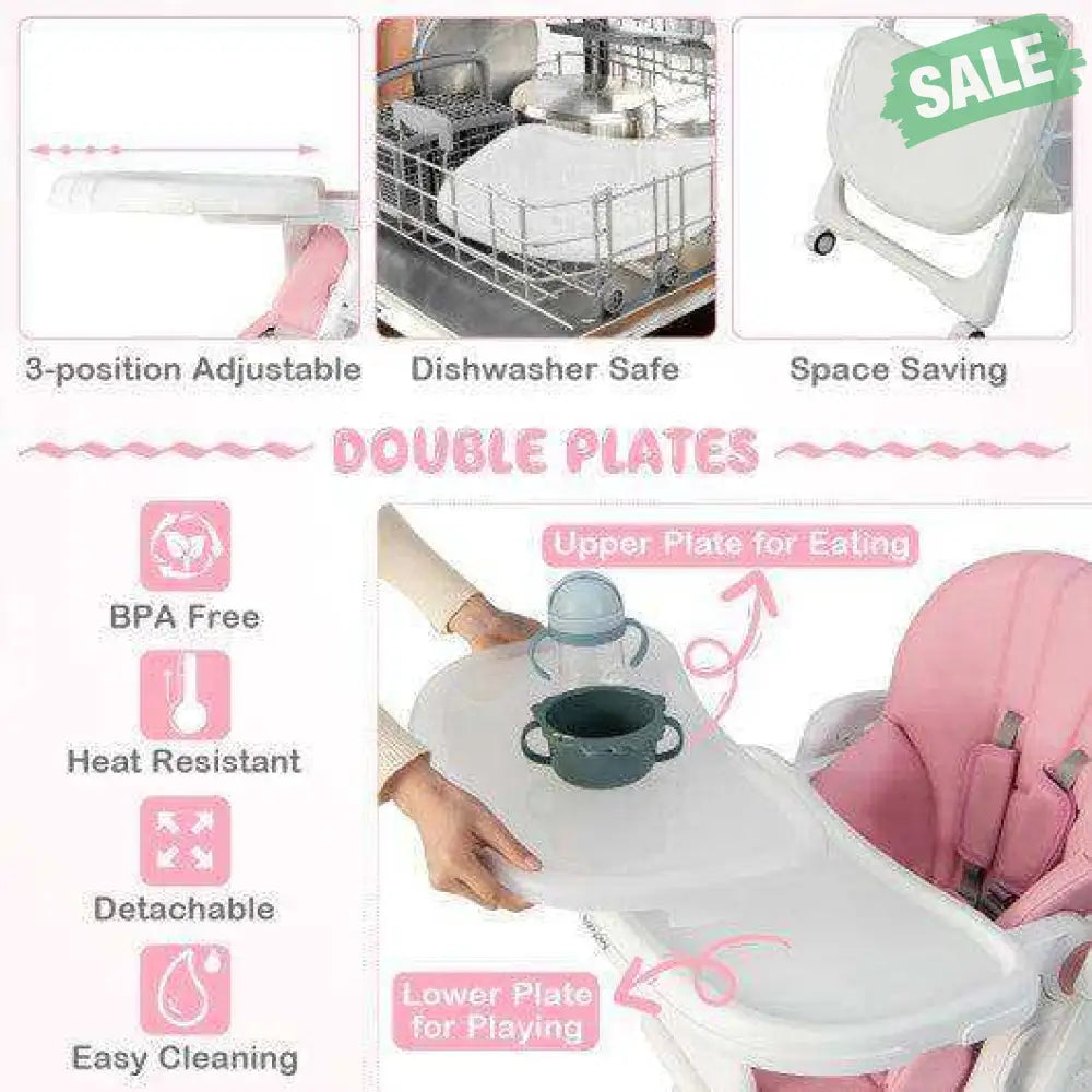 ● Removable and Washable Tray and Cushion: The foldable high chair features double plates with upper plate for eating while lower plate for playing. And the soft PU cushion has 2 positions for option. Besides the dishwasher safe tray and the machine washable cushion simplify daily cleaning for great convenience.