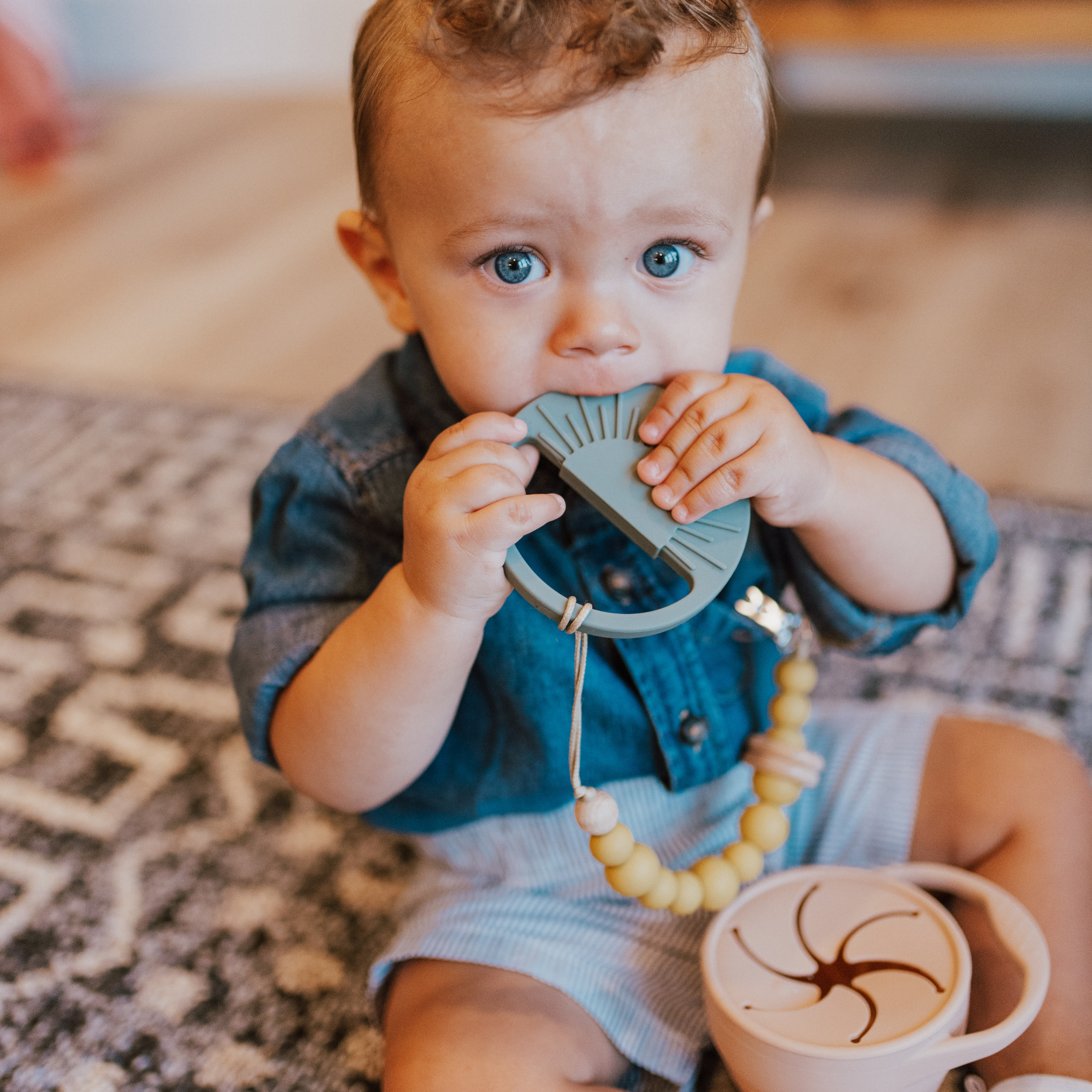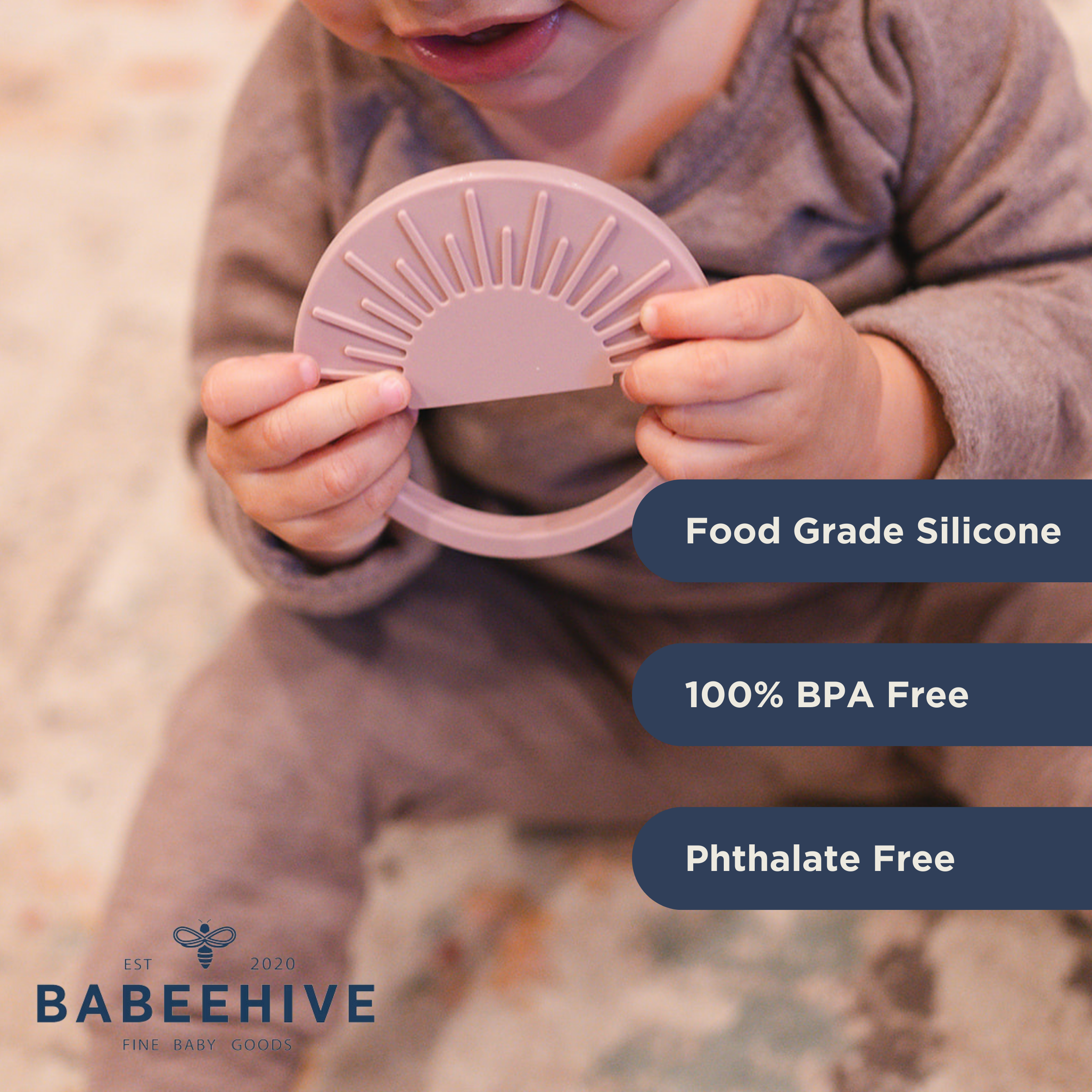 Babies love chewing on the fun shapes of this light, easy to grip teething toy. Choose from beautiful colors colors to incorporate this adorable, sunburst teething toy into your little one's toy collection. These teethers are enticing for even pre-verbal babies. Made out of strong but gentle silicone, our teethers are made to accompany your baby through those days of teething, providing some relief with every chomp!