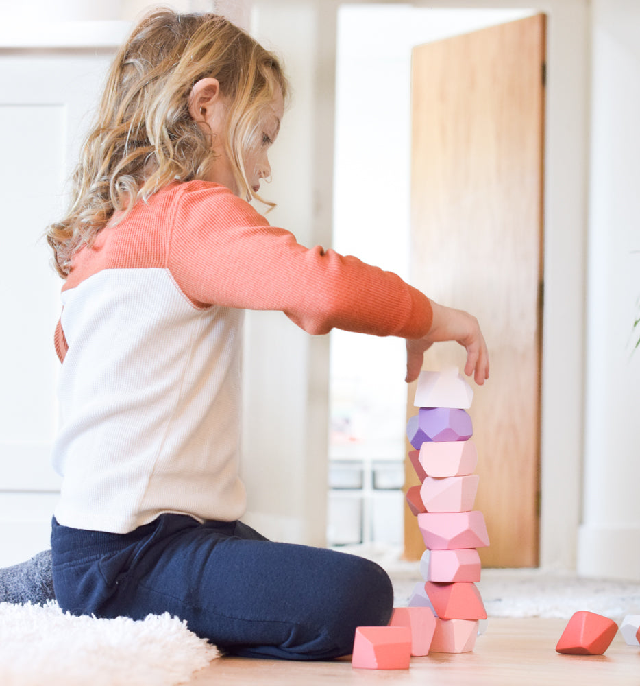 The 16-piece "Cupid" Rock Blocks set is a vibrant celebration of color and creativity, ideal for children who relish in imaginative play. This expansive set, with its captivating shades of pink, lilac purple, and cherry red, offers endless opportunities for building and creativity. Handcrafted in the USA, these Montessori wooden blocks foster open-ended play and enhance cognitive skills in older children and those ready for more complex challenges.