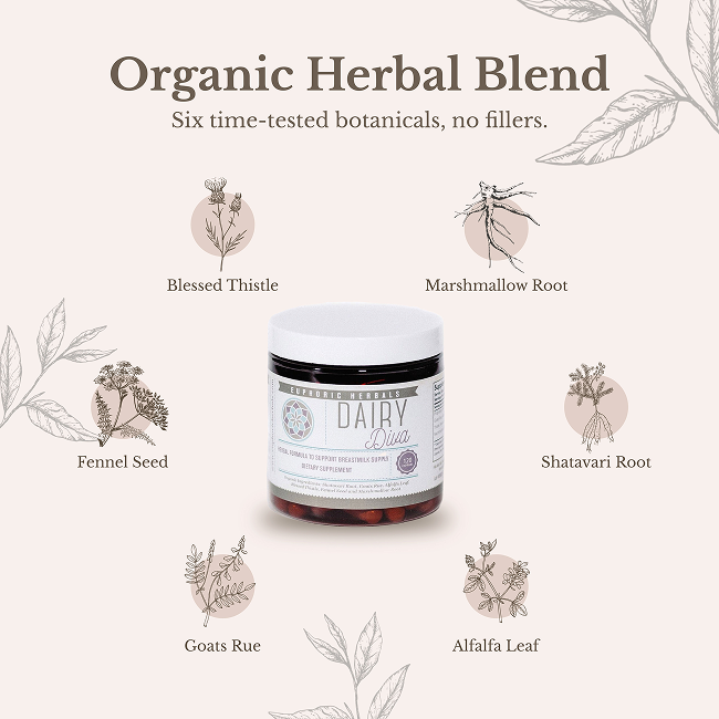 Organic Ingredients: Shatavari Root, Goats Rue, Marshmallow Root, Blessed Thistle, Alfalfa Leaf and Fennel Seed