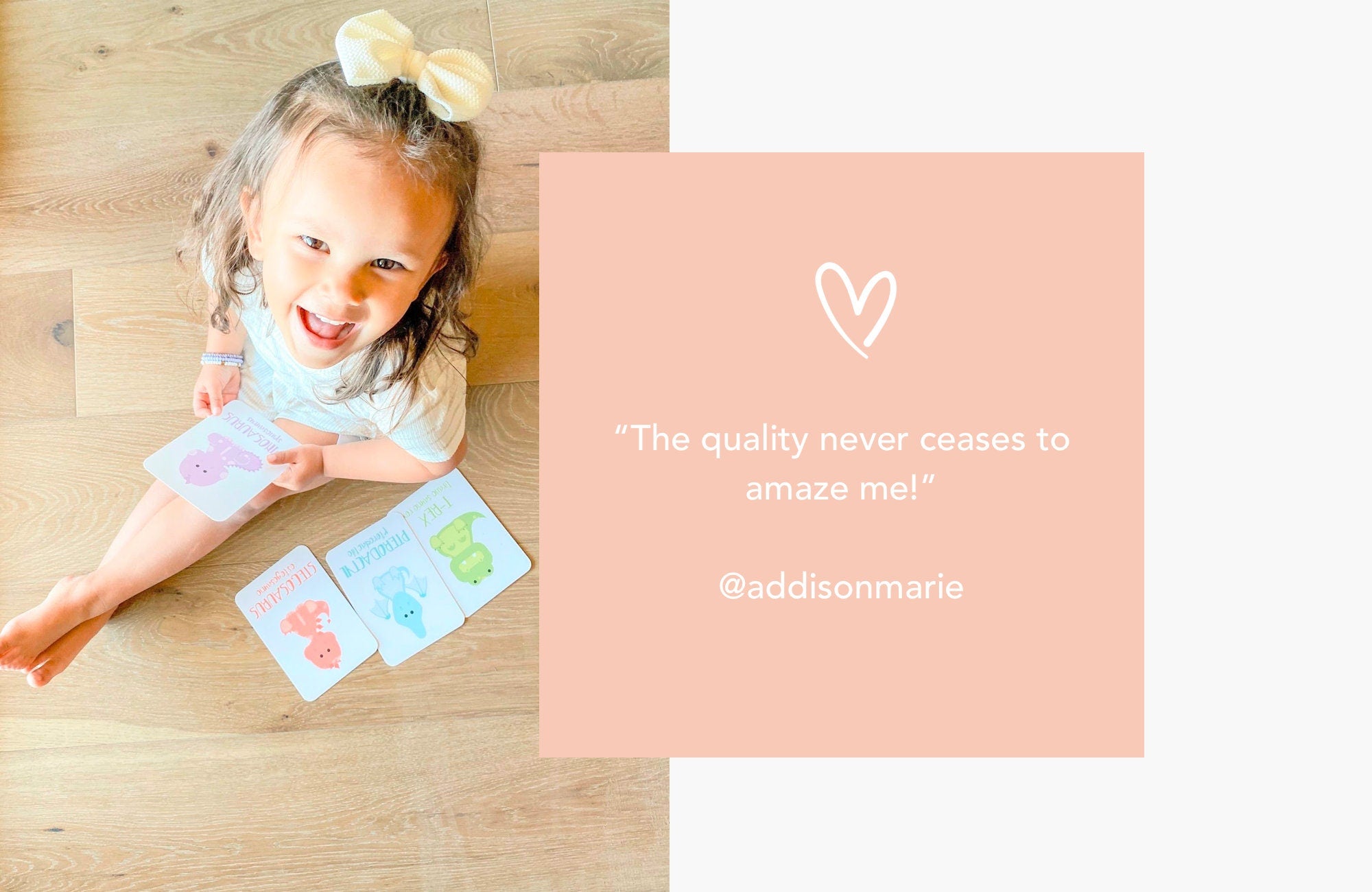 If you’re a busy mom like me, trying to multi-task while keeping the kiddos occupied can be a huge pain! These durable premium hand-illustrated flashcards are the perfect way to keep little ones aged 10months to 6 years old busy while learning new concepts. With a wipeable matte coating and thick 19pt card stock, you never have to worry about these getting messy or ruined during play. Pair these flashcards with other objects and toys for identification and independent play.