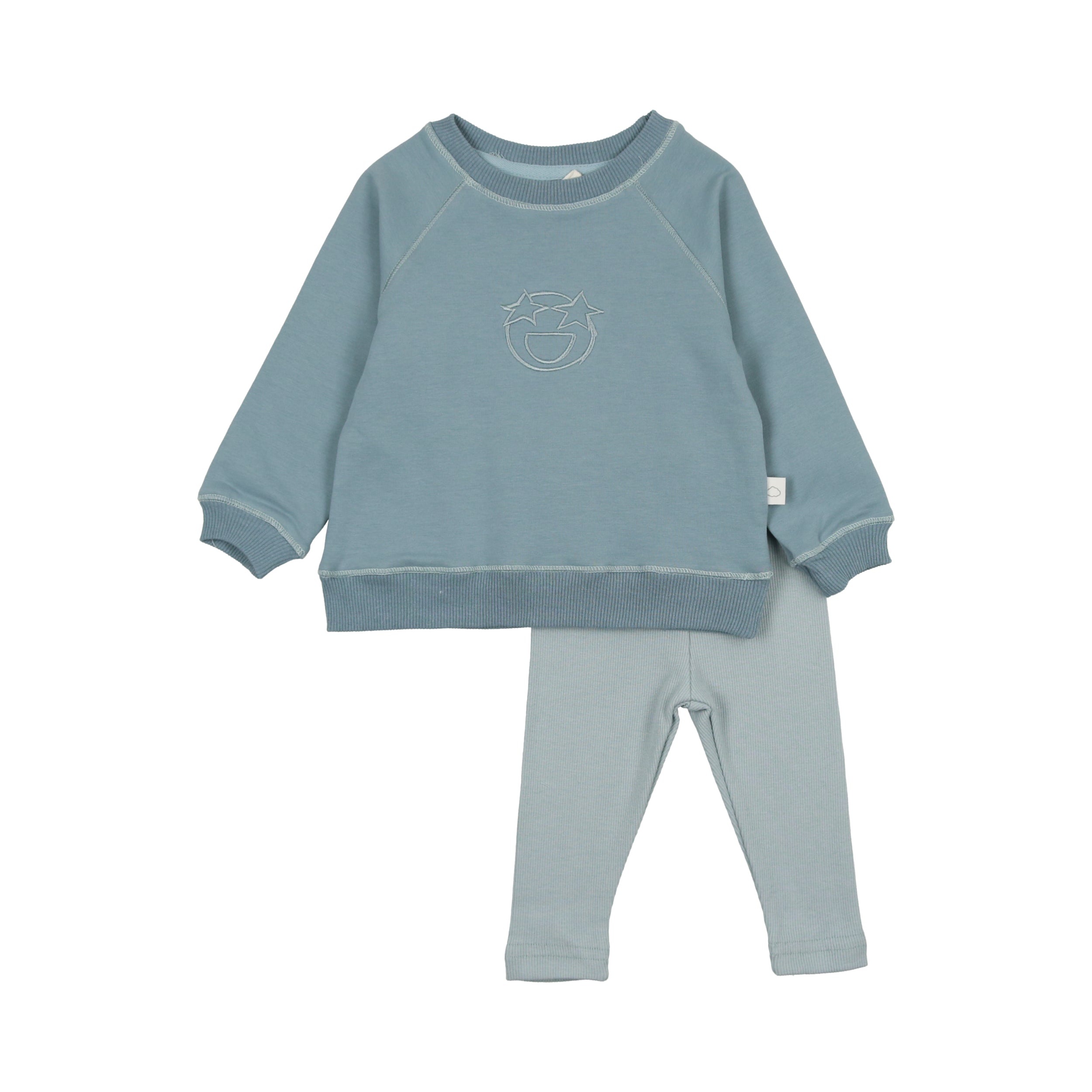 This buttery soft Blue Emoji Set is perfect for both lounging and heading out! With an adorable embroidered emoji and an oversized French terry sweater paired with matching ribbed leggings, your kids will live in this set. Comfort meets style in this must-have addition to any wardrobe!