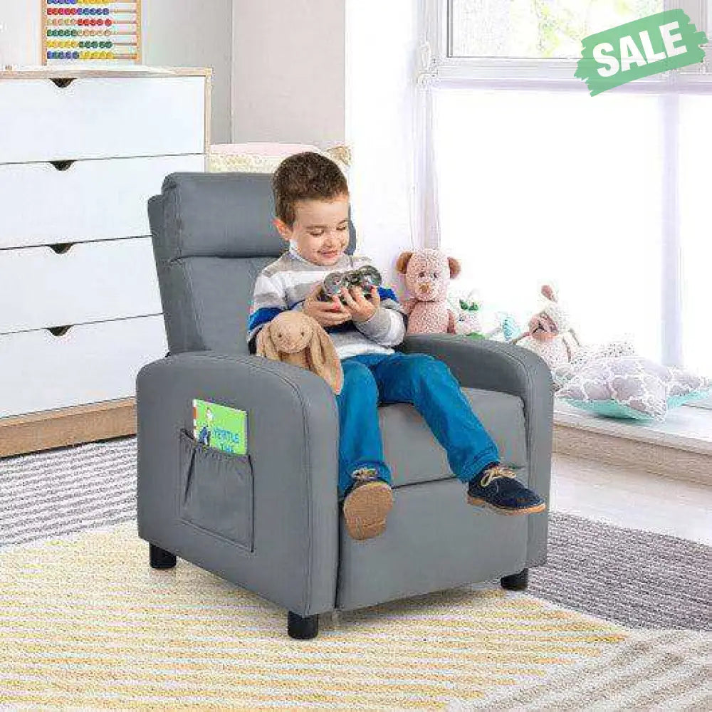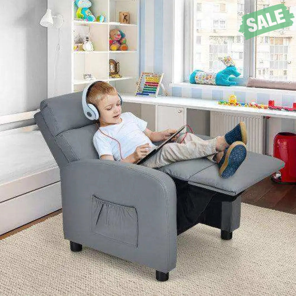 Featuring an adjustable design from 90° to 130° this multipurpose recliner offers a cozy place for kids to read books watch TV play games take a nap etc. The high-density sponge padding and soft PU leather surface provide optimal comfort. Besides the PU leather surface is also waterproof wear-resistant and easy to wipe clean. The sturdy wooden frame and anti-slip feet not only ensure great stability but also make it safer for children to climb up and down on the chair. In addition there is a side pocket to keep your kids’ favorite books small toys or snacks with reach. With the simple and stylish design this kids recliner will be a perfect addition to the child's bedroom playroom living room home theatre daycare etc.