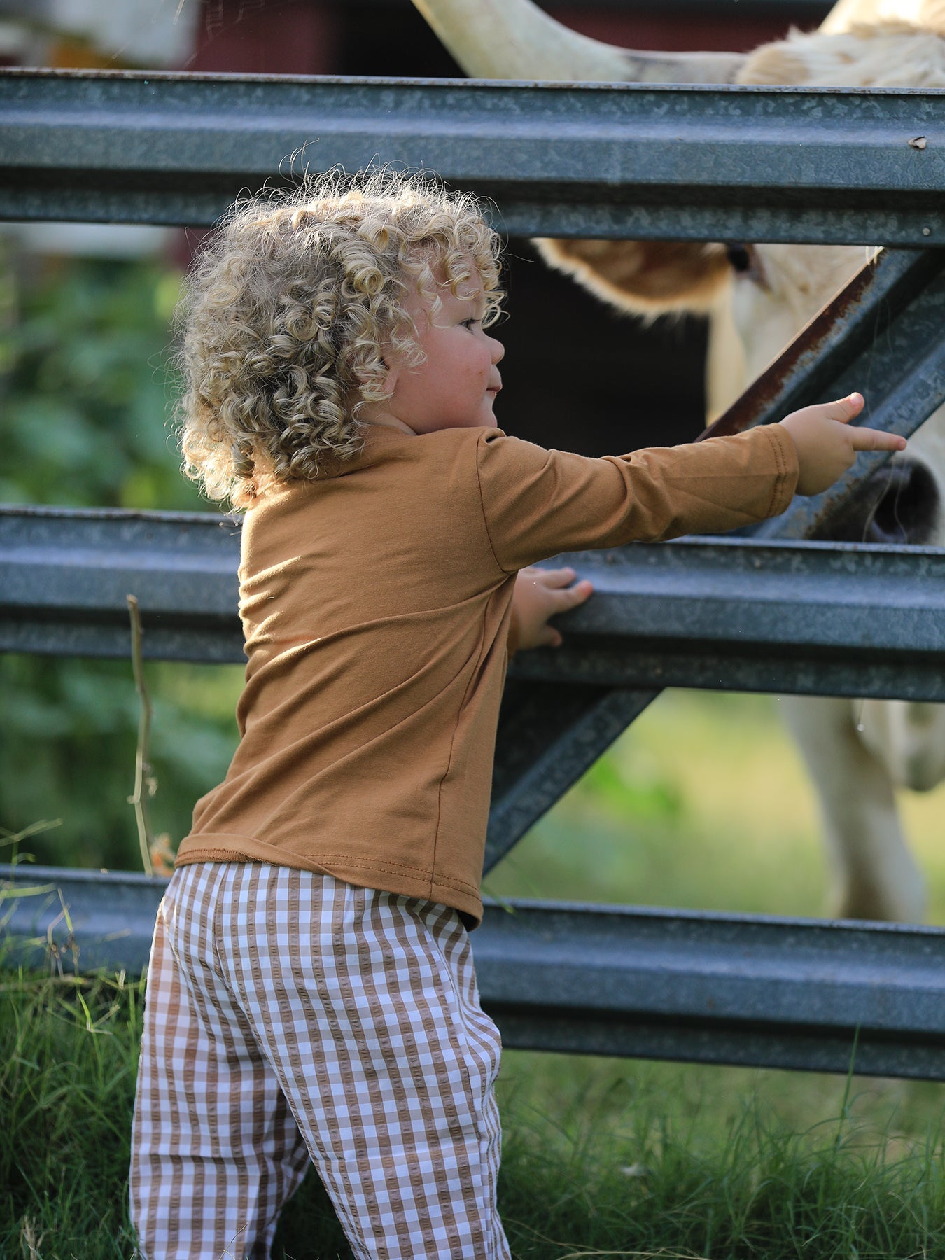 Dress your little man in style this Thanksgiving with our Boys Thanksgiving Smocking Embroidered Brown Plaid Outfit Set. The smocked embroidery adds a touch of charm to the classic plaid design. Perfect for family gatherings and photos, this set will keep your little one looking sharp and comfortable all day long.
