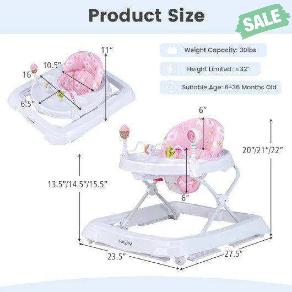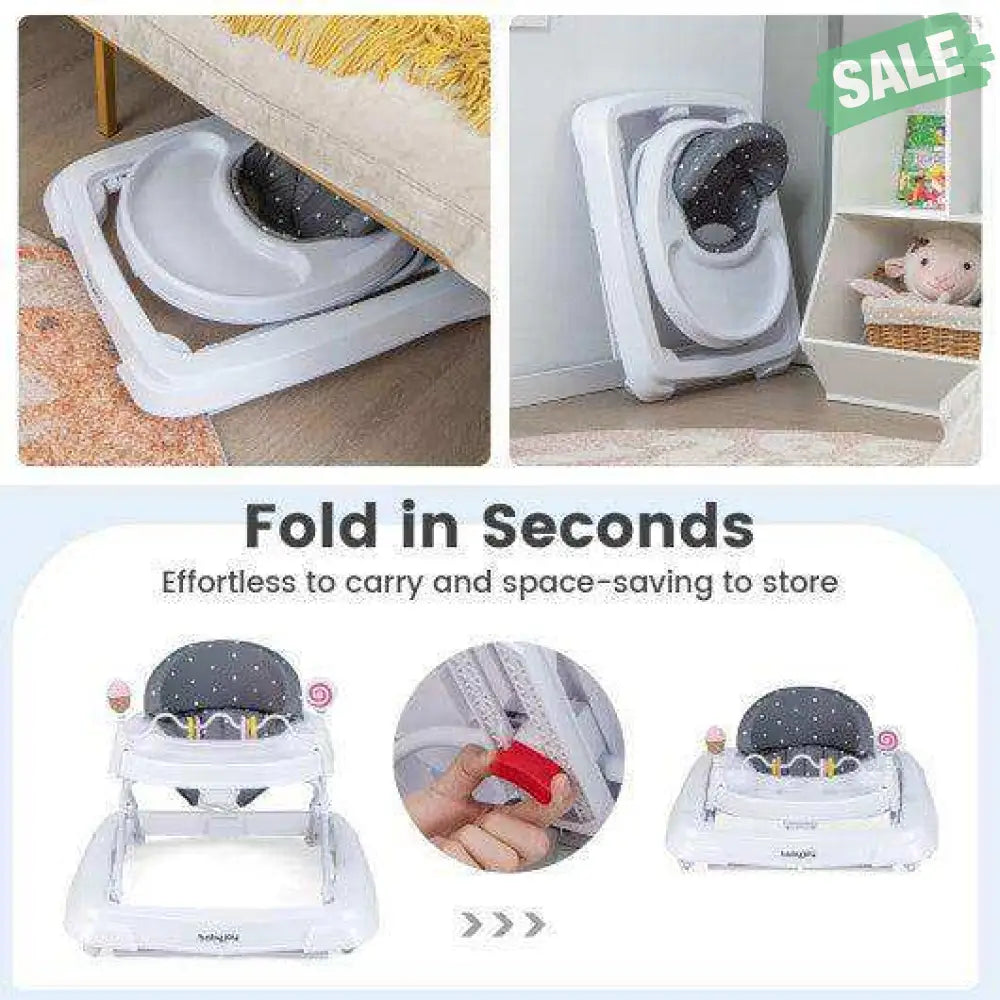 ● Fold in Seconds: When not in use the baby walker can be folded into a much smaller size. The folded baby walker is effortless to carry and space-saving to store. Moreover the universal front wheels make it easy to move anywhere your kid wants.