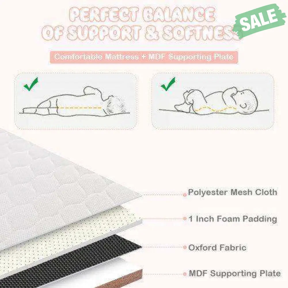 ● Perfect Balance of Support and Softness: This baby bed comes with a comfortable mattress and a MDF support plate to ensure your baby's utmost comfort while sleeping. The mattress is made of polyester mesh cloth 1 inch foam padding and Oxford fabric which provides a cozy and soothing sleeping surface for your little one.